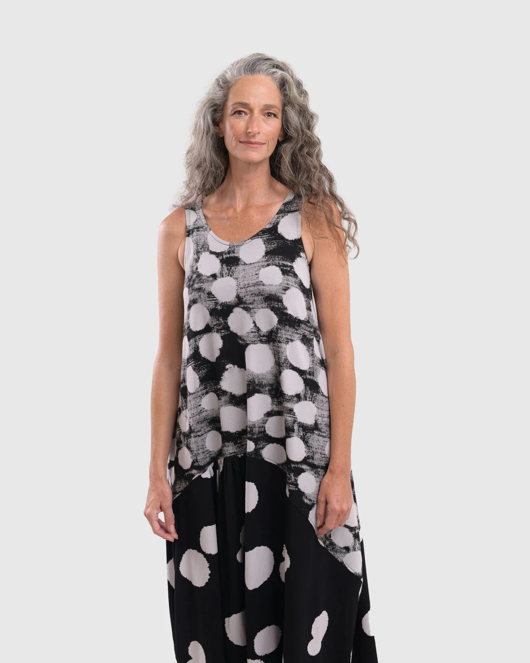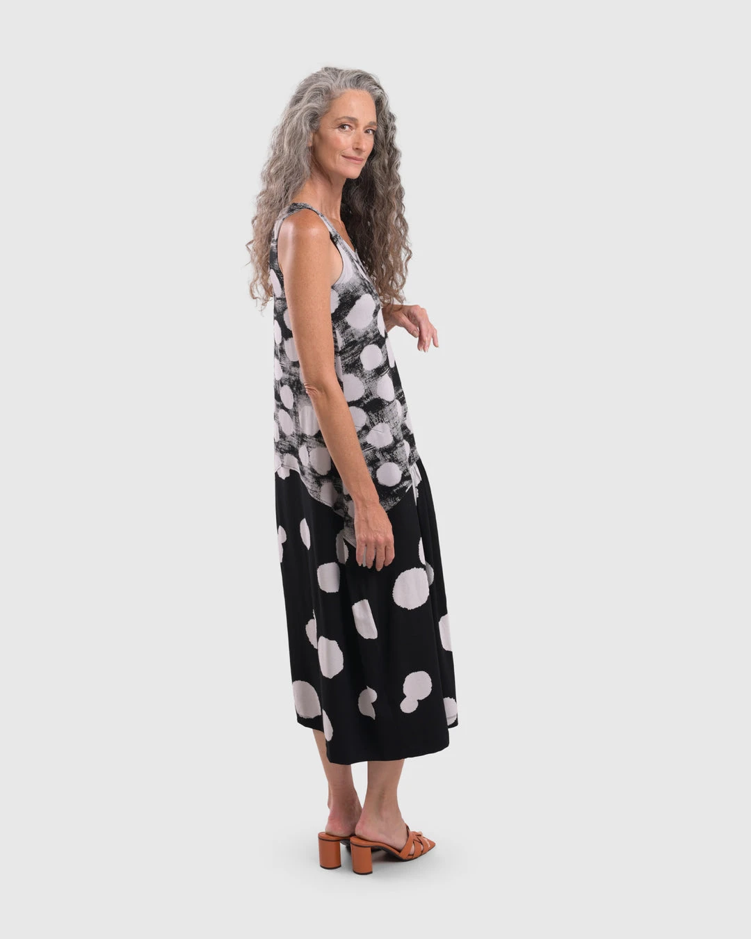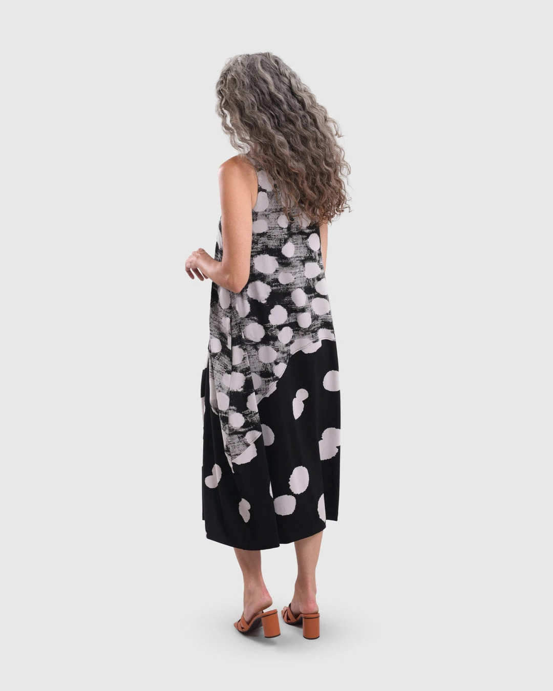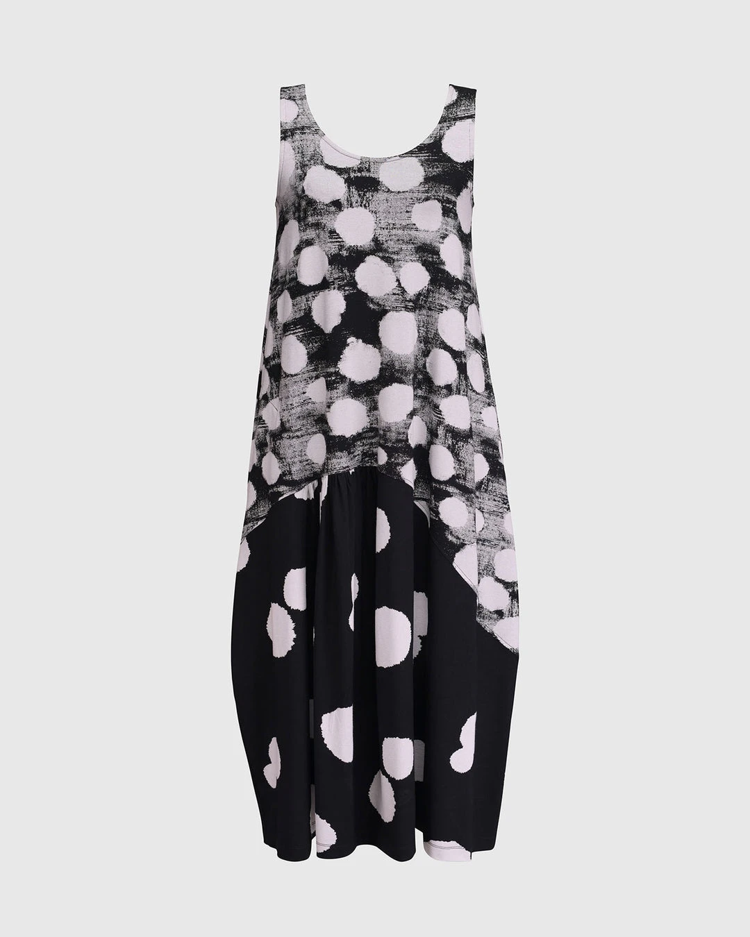 This effortless chic style has a relaxed cocoon body in mixed dot prints, with curved seam panels. Wide bra-friendly straps, a round neckline and mid-calf length even hemline complete the details.
