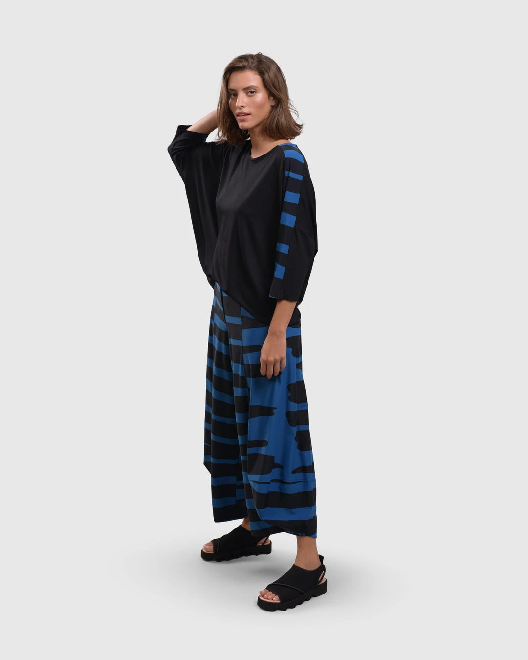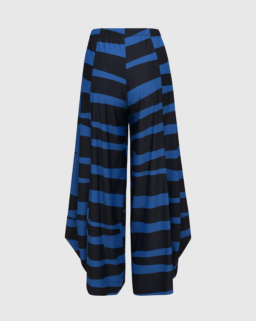 An Alembika favorite and signature silhouette, the punto pant style has seam detail ballooned legs with faux fly detail at elastic stretch pull on waist. In a bold striped print in signature Tekbika fabric.