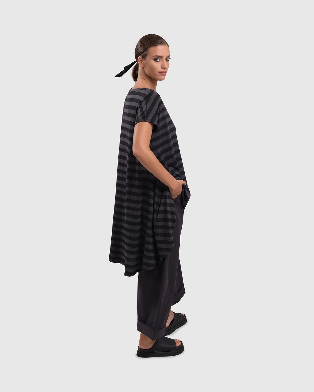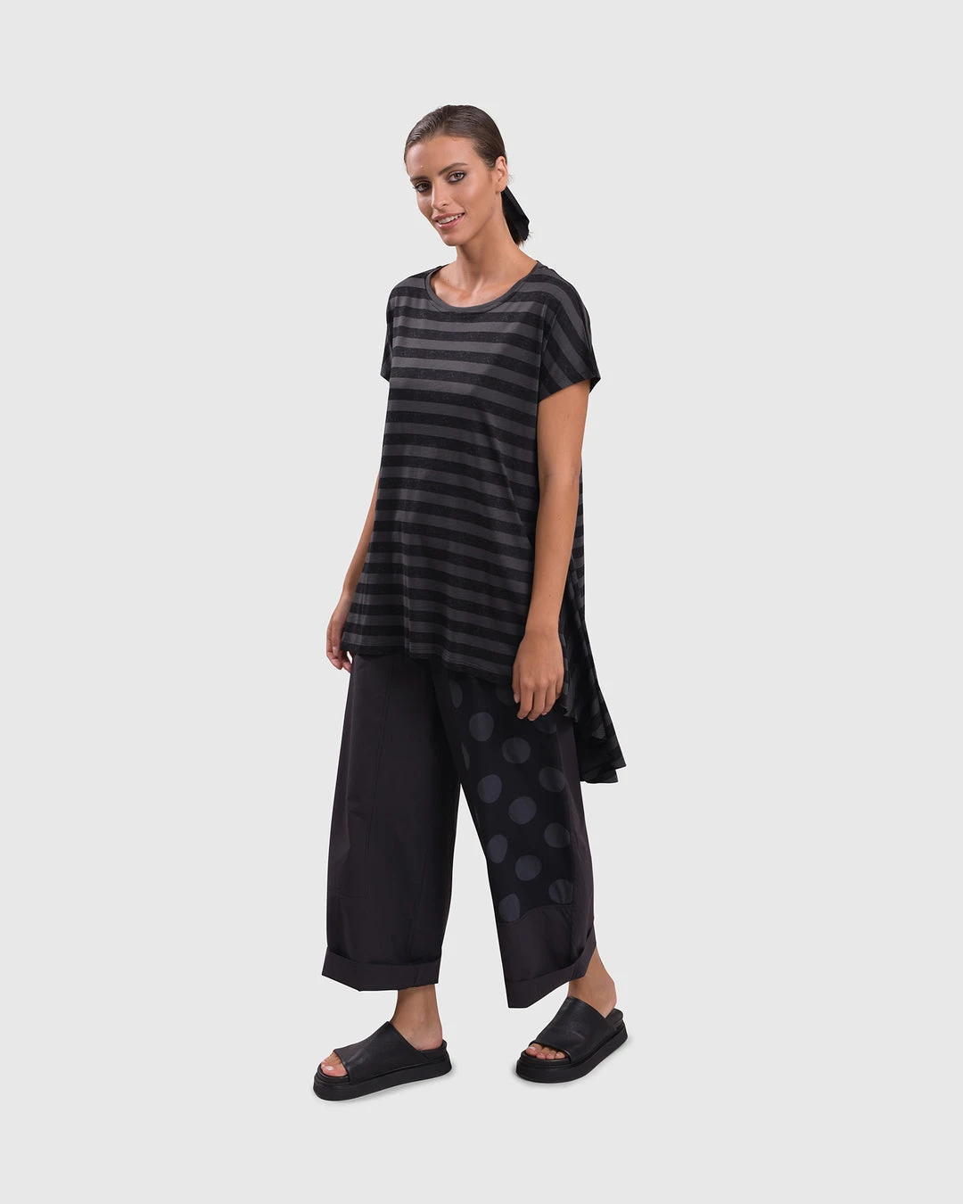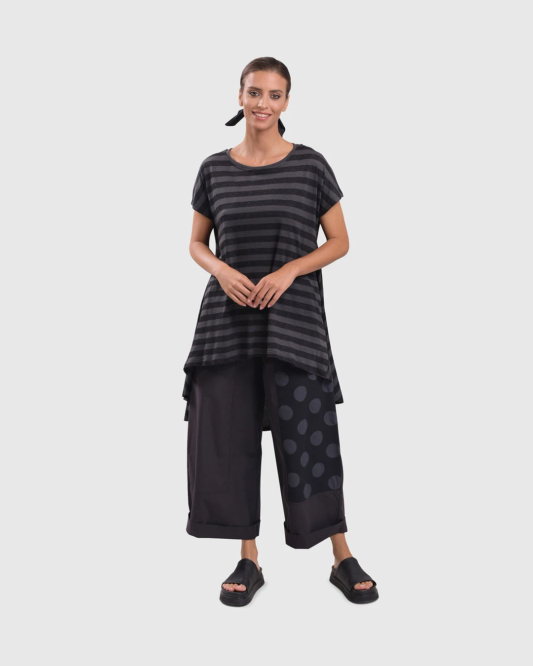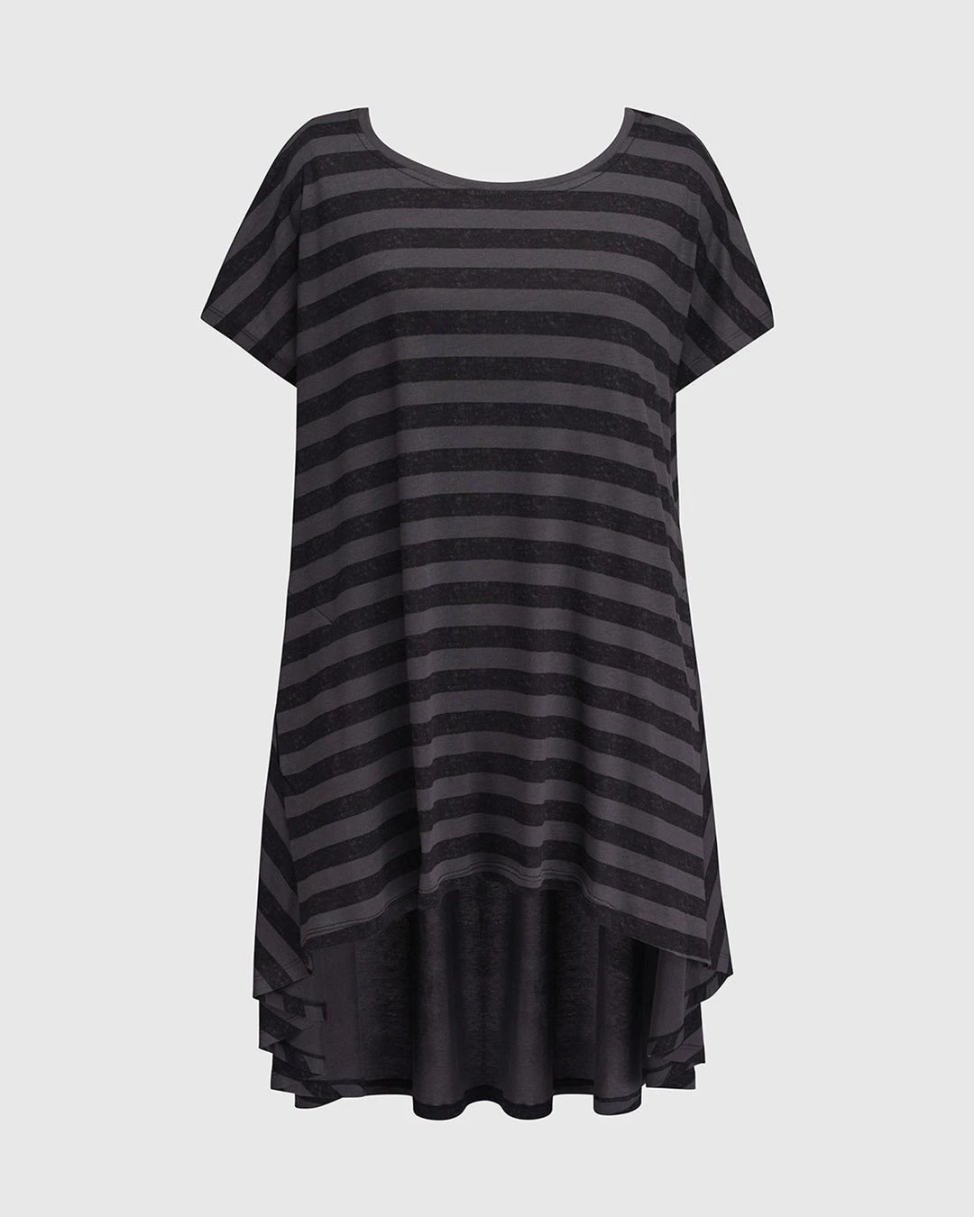 This easy tee has a full a-line body with dramatic high low hemline. Side seam pockets, a round neckline and short cap sleeves finish the details.