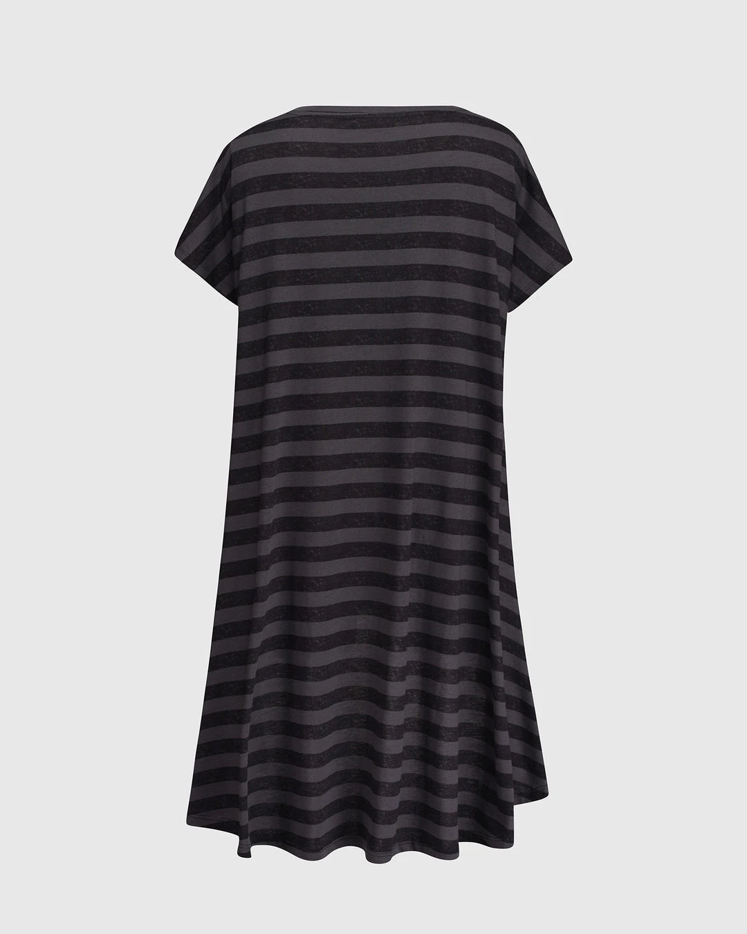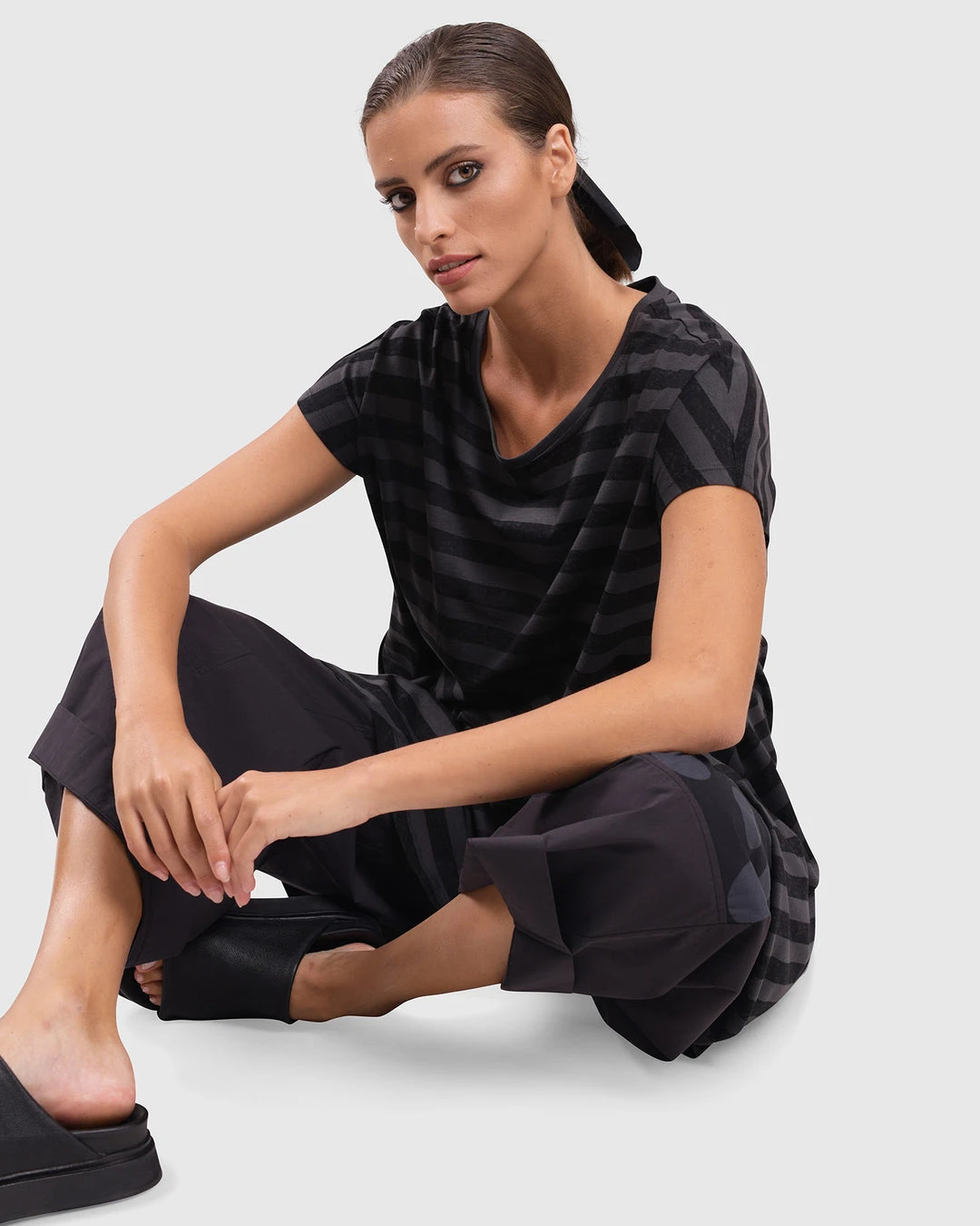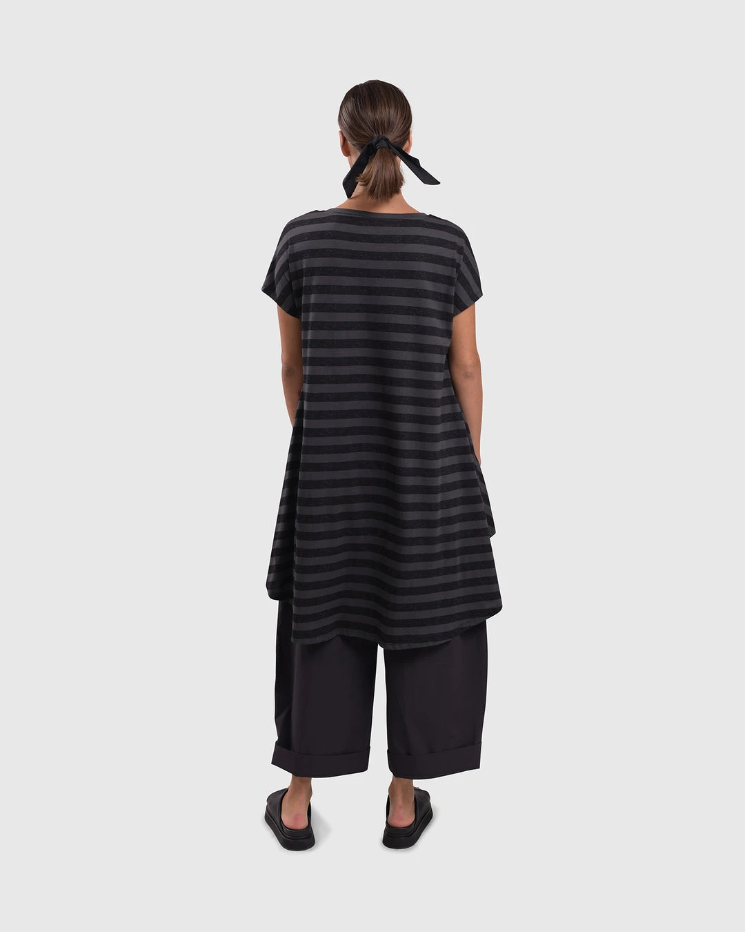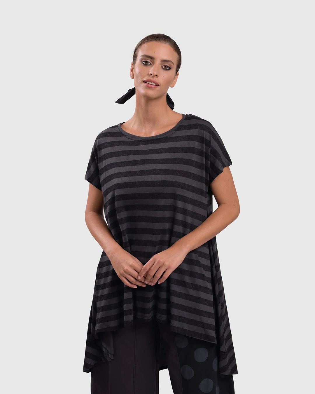 This easy tee has a full a-line body with dramatic high low hemline. Side seam pockets, a round neckline and short cap sleeves finish the details.