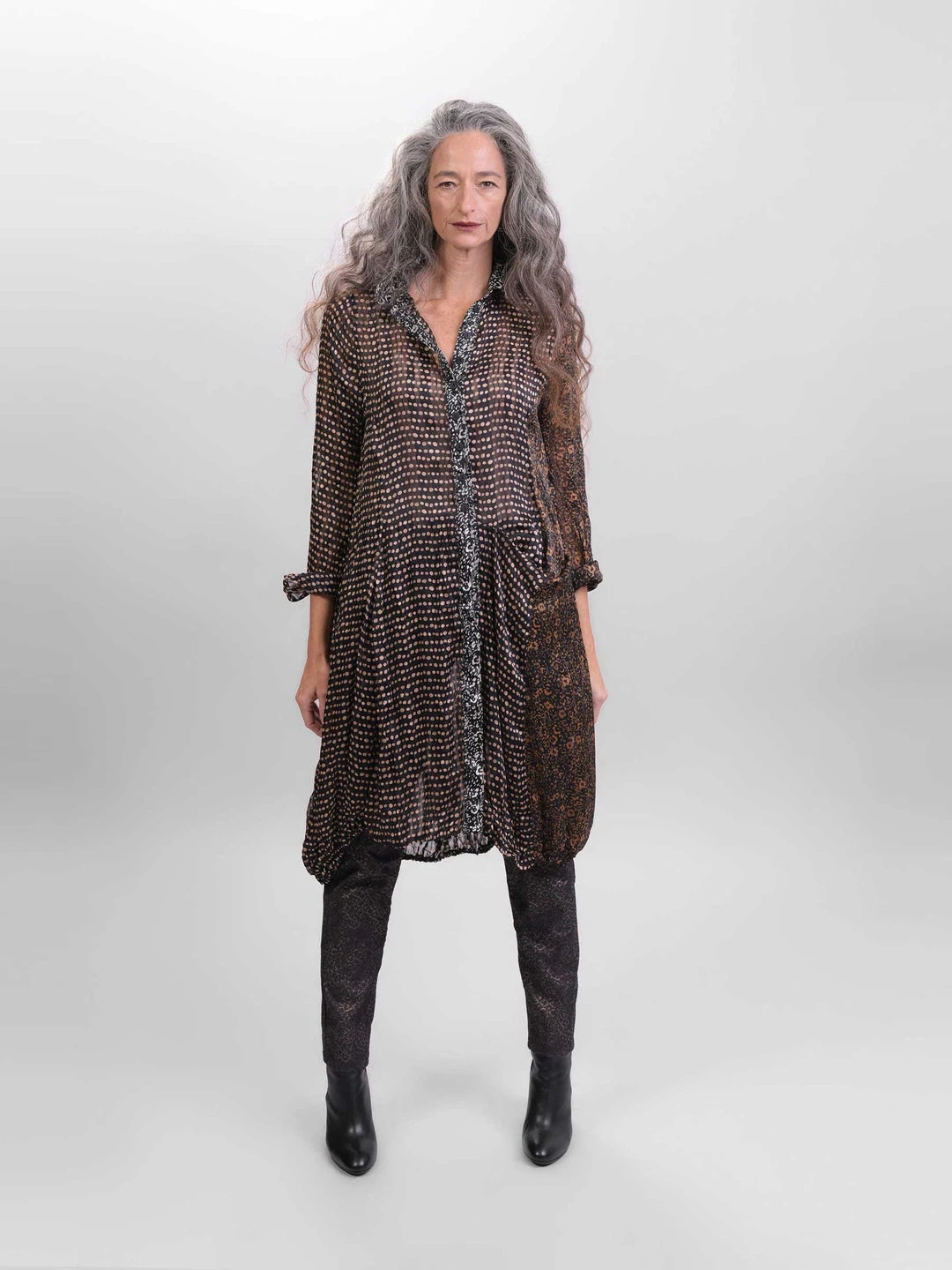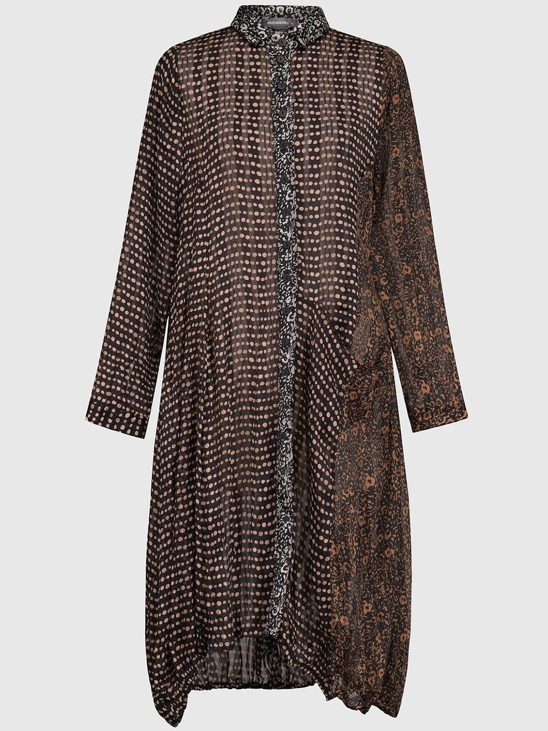 Alembika’s signature Wonderful Dress stands out in mixed prints of sheer georgette chiffon. The slim fit body has a half button front with classic collar and balloons at skirt with a dramatic draped pocket at one side. The long set-in sleeves have cuff detail at wrists, while the elasticized bottom hemline adds a bubbled effect.