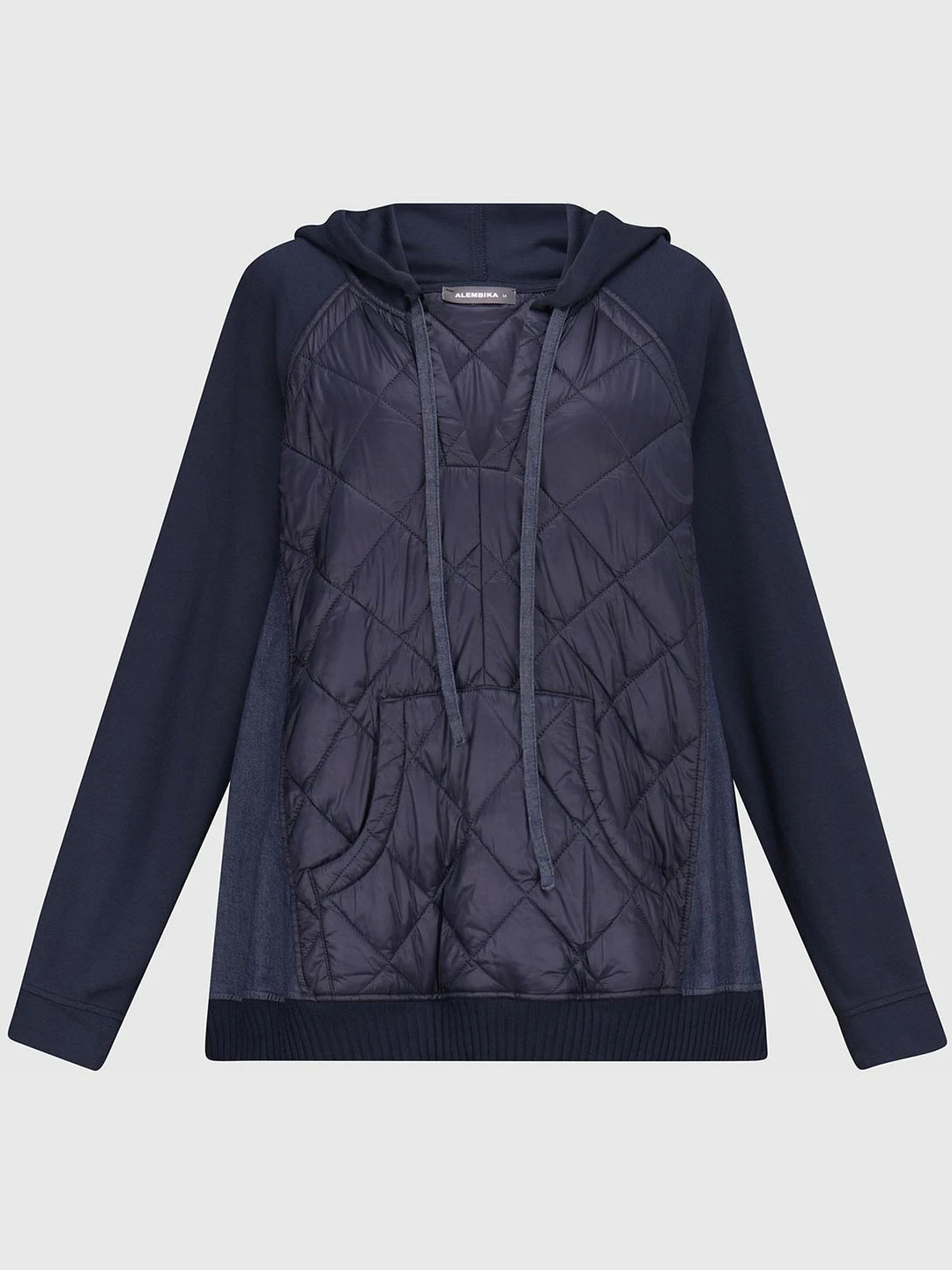 Alembika’s jean styles always stand out and this casual chic style is no different! In a mixed body of denim and coordinating quilted fabric, along with solid knits, it has a roomy relaxed body with drawstring detail at the hooded neckline. A round kangaroo style pocket and raglan set long sleeves complete the look. Ribbed knit trim at the even hemline adds the finishing touch.