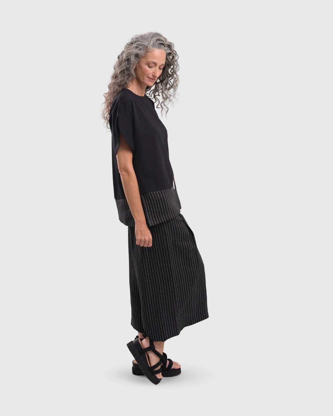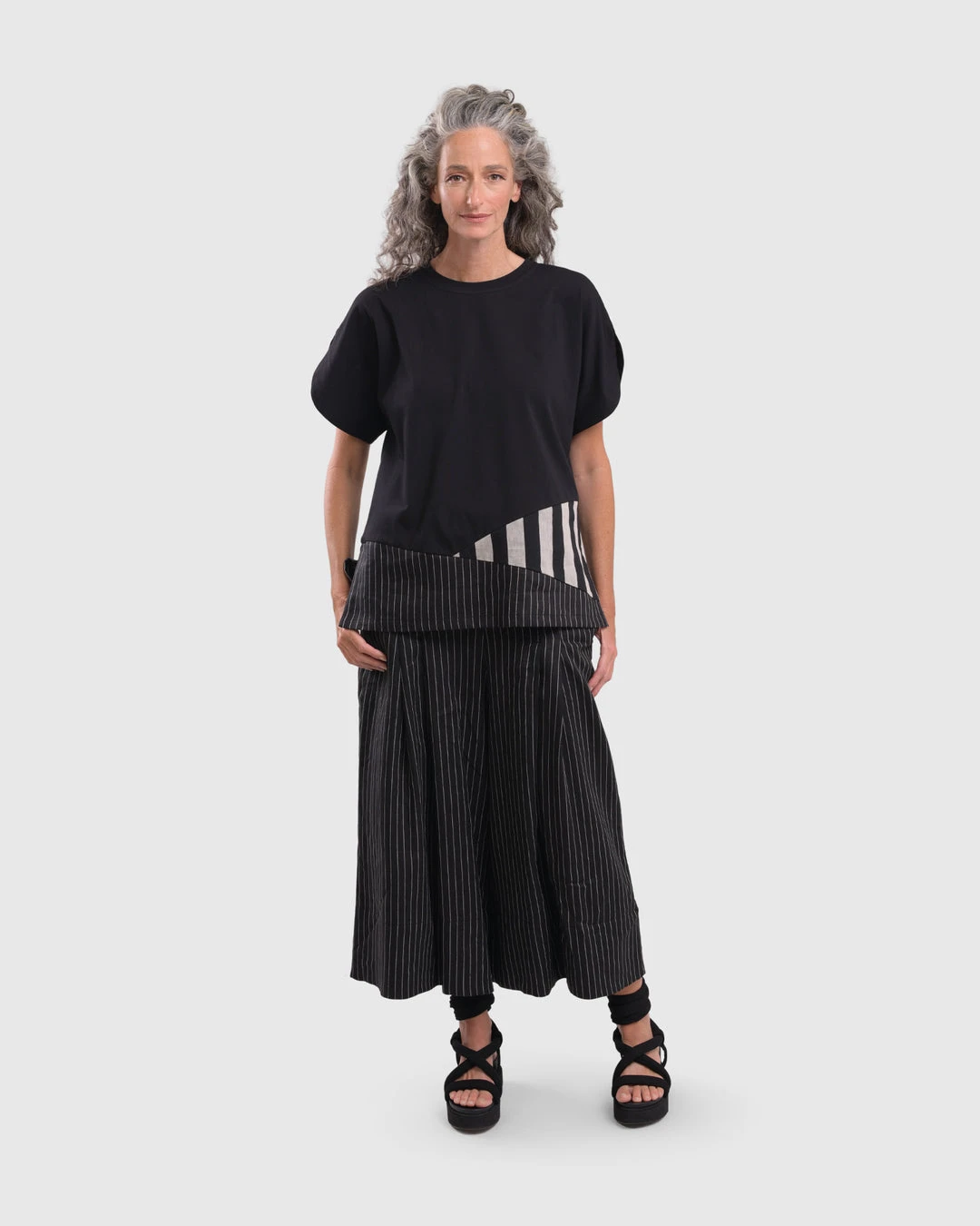 This easy tee has beautiful touches, elevating it from the norm. With a short boxy body in jersey knit, it features an asymmetric mixed panel accent at hemline, along with short vented sleeves. A round crew neckline and even hemline with side vents completes the look.