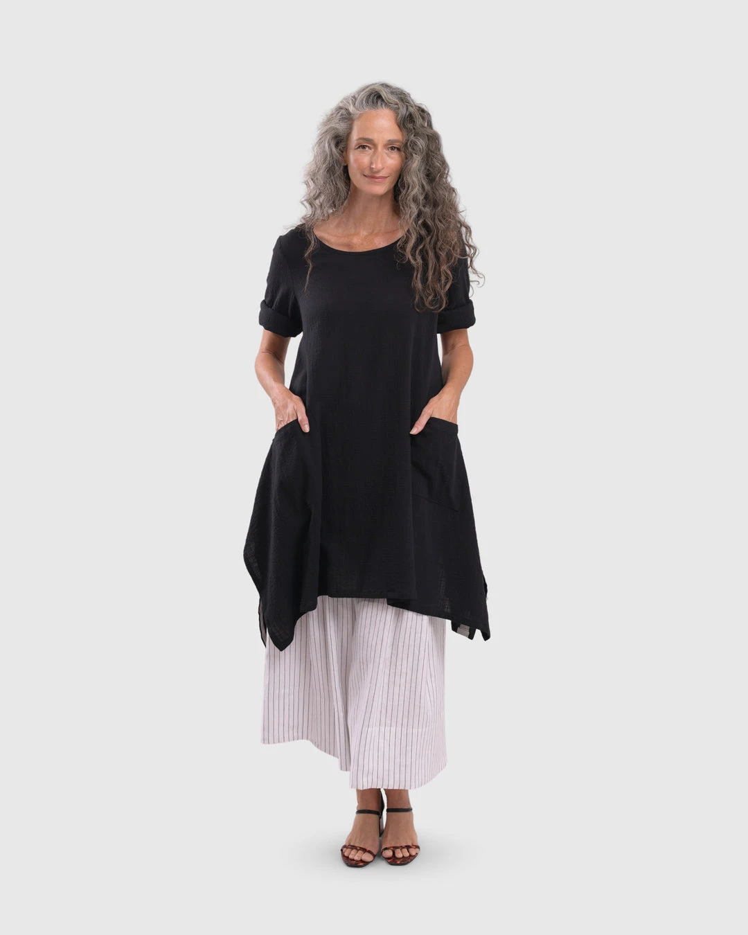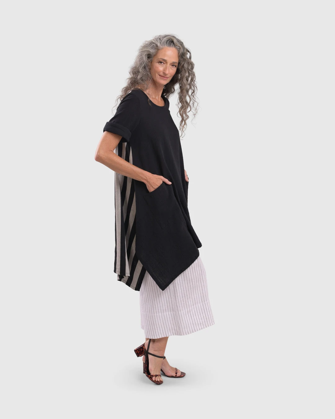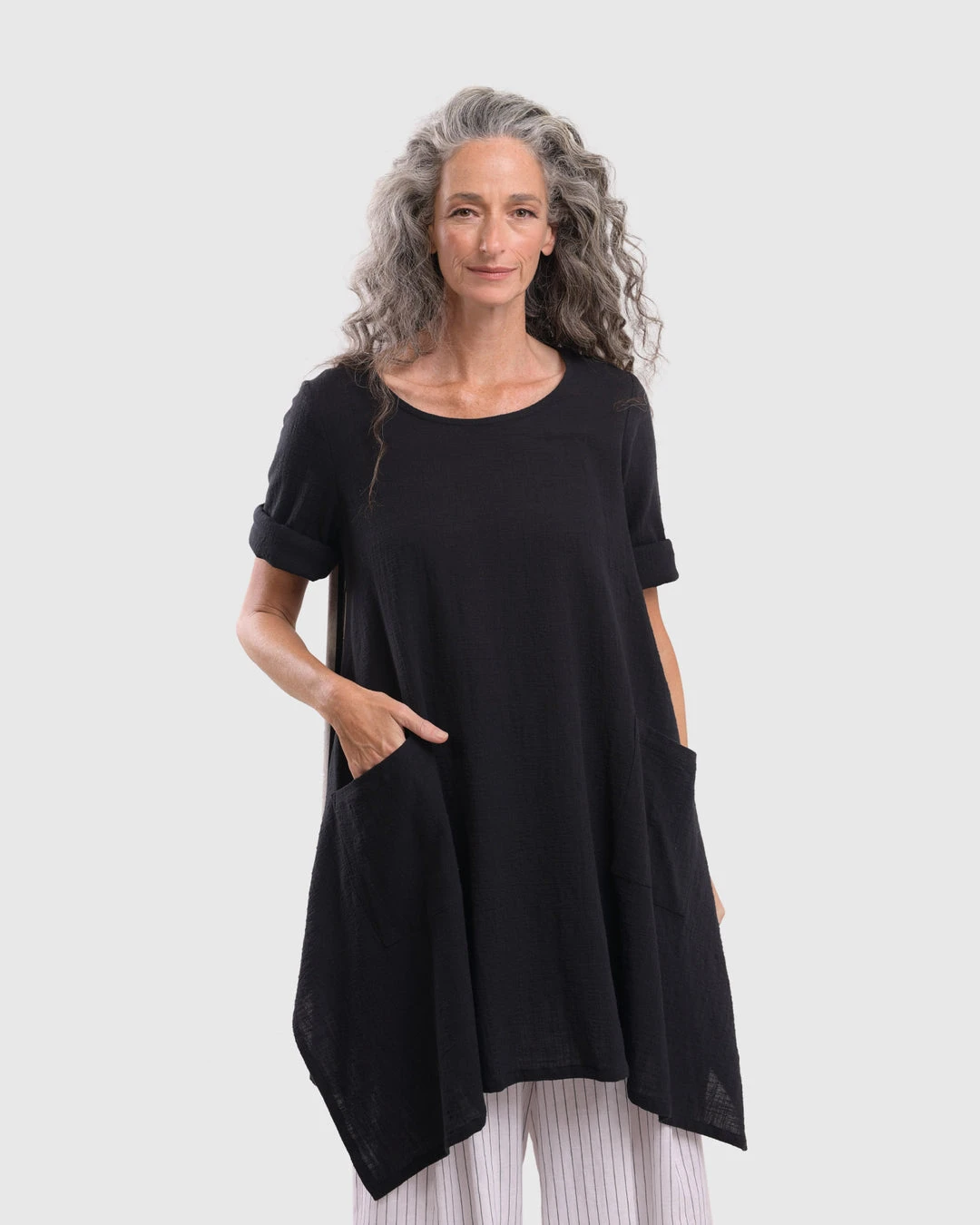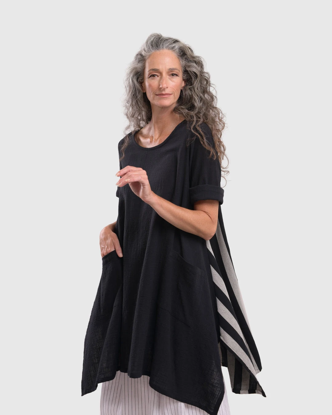This breezy tunic has a roomy relaxed body and features a striped woven back with solid gauze at front. Accent pockets, a round neckline and high low hemline with angled side vents complete the look.