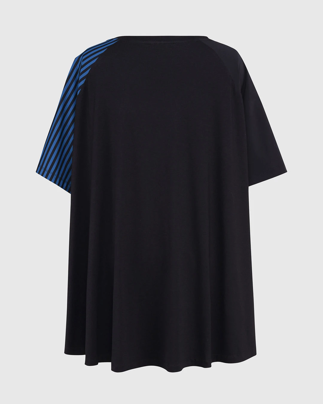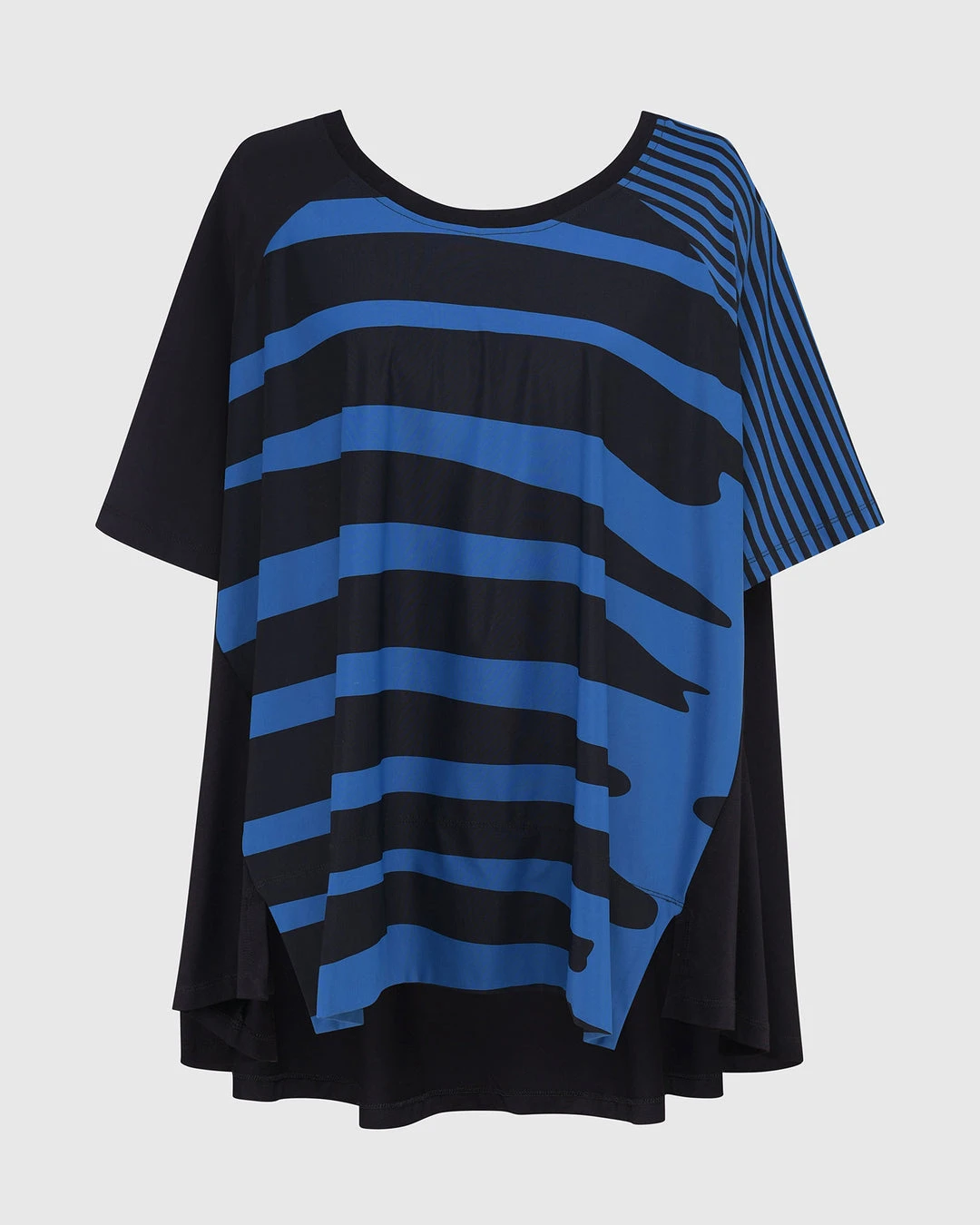 Alembika’s signature silhouette is easy chic in a mixed knit body that featues Tekbika fabric in a bold stripe pattern at front, with a coordining striped accent sleeve. This oversized swing shape features a high low hemline with front vents, along with a round neckline and raglan set short dropped sleeves.