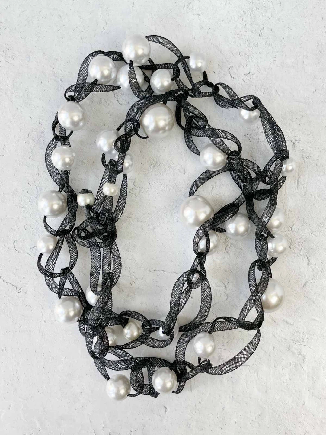 This style features various sized pearls on tulle cord that is knotted and linked. Wear long or doubled around the neck.