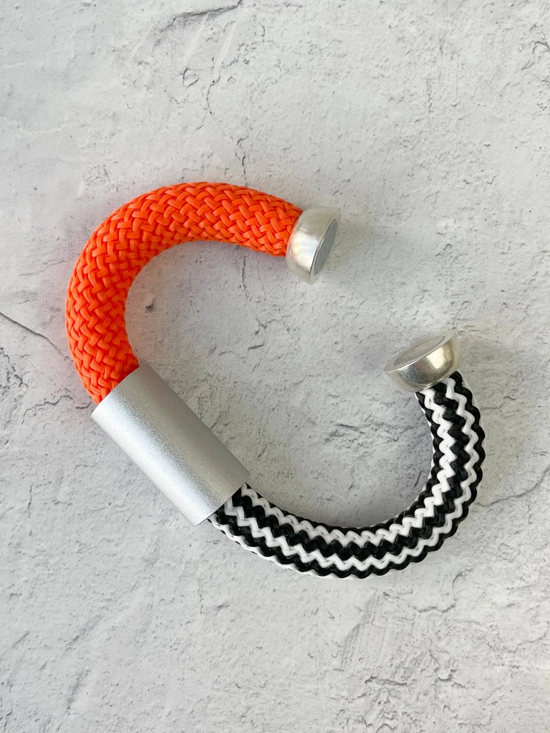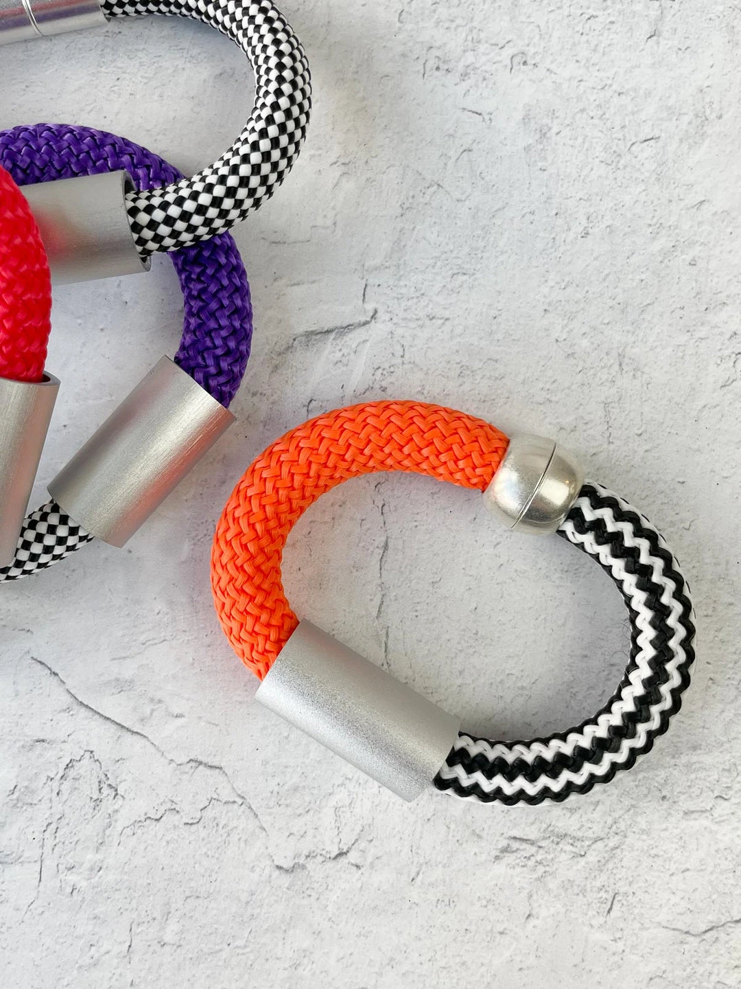 This stackable style features an aluminum tube centerpiece along a mix of solid and patterned woven cord. Magnet clasp at back for easy on and off.