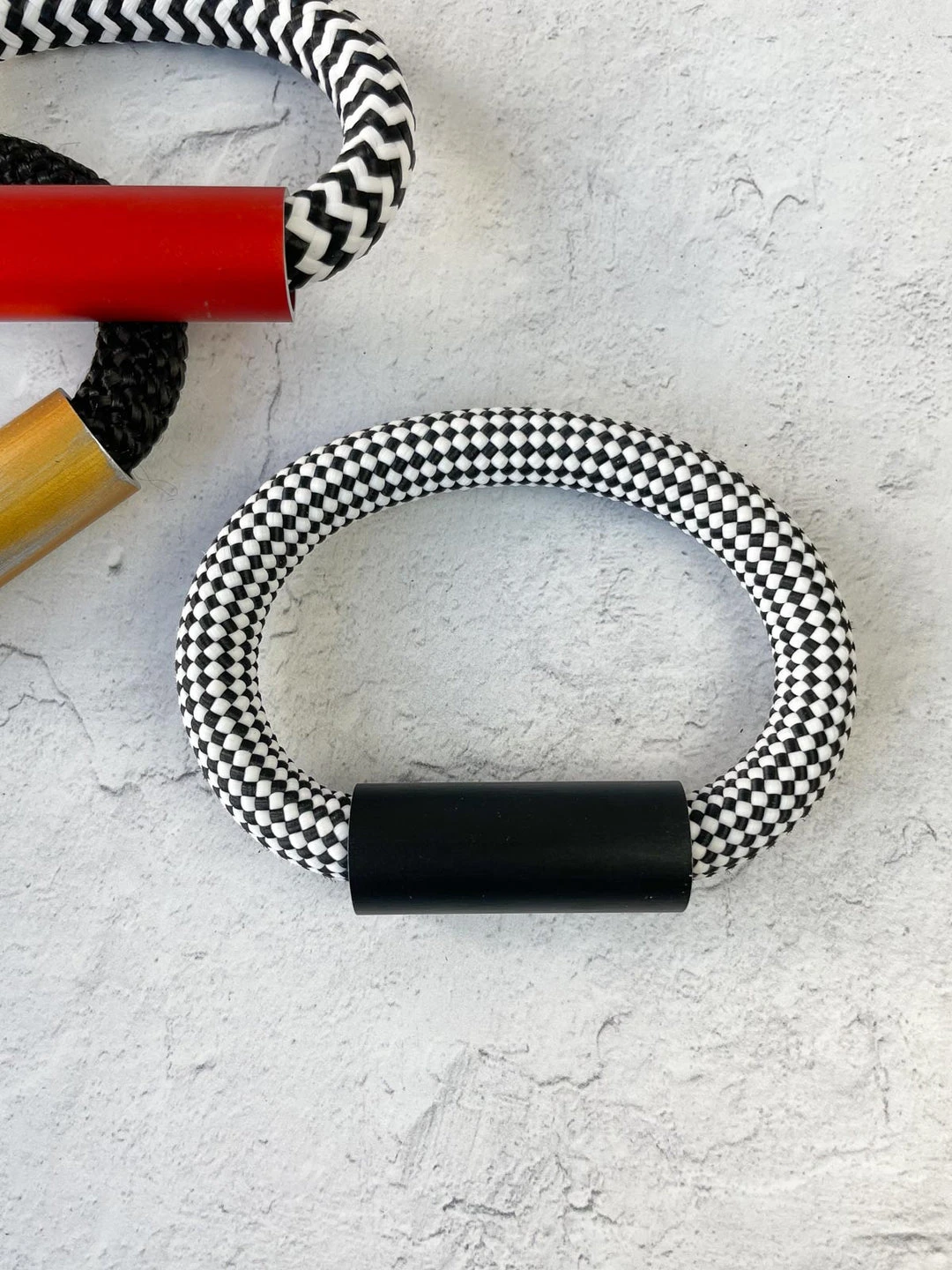This stackable style features an aluminum tube centerpiece along woven cord. Hidden magnet clasp for easy on and off.