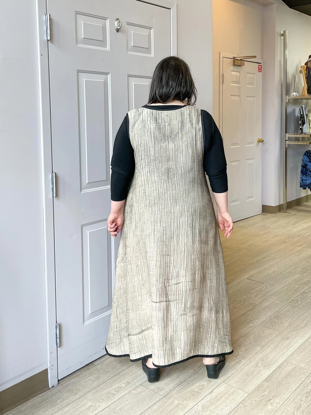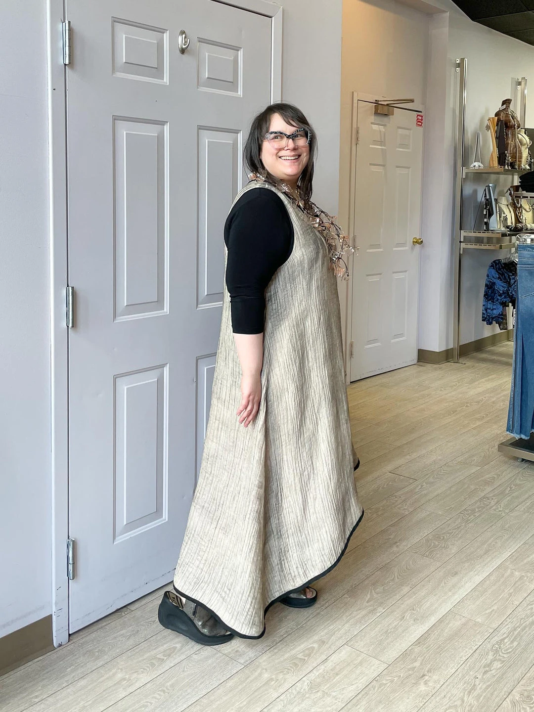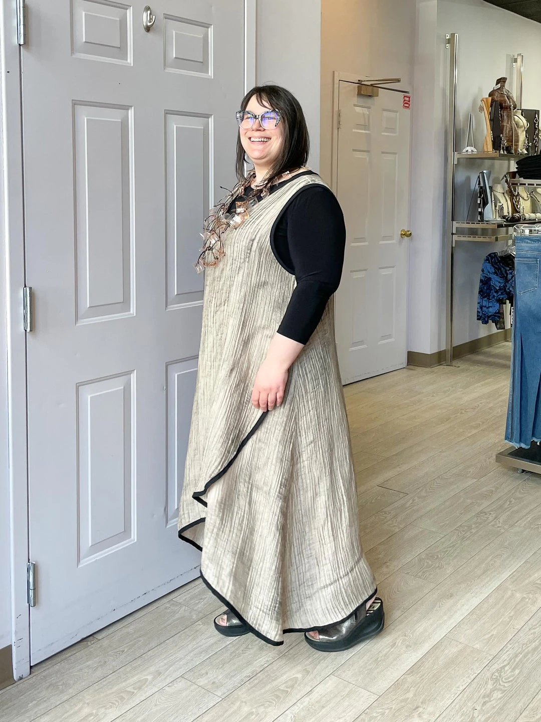 Cynthia Ashby’s Joy Dress is a sophisticated and artful sleeveless jumper style in a natural hued linen blend crush fabric that features all over airbrush hand-pant detail. Trimmed in contrasting black piping it features a crossover detail at front with a high low hemling. The relaxed a-line body has a round neckline and oversized arm holes. A beautiful piece to wear a little tee under or pop a cropped topper over.