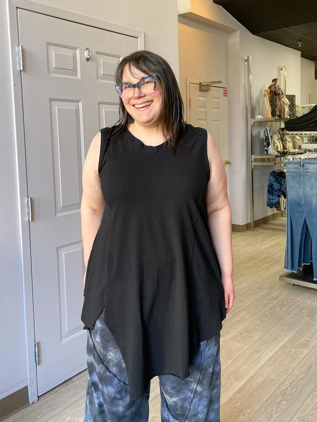 Cynthia Ashby’s Katy Top is an artful basic in solid cotton jersey knit. The sleeveless a-line tunic features overstitched princess seaming with an angled vent detail at the circular raw edge hemline. A finished rounded v neckline finishes off the look.