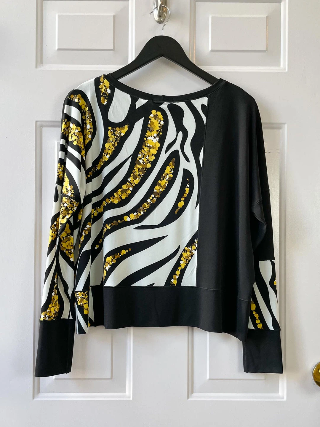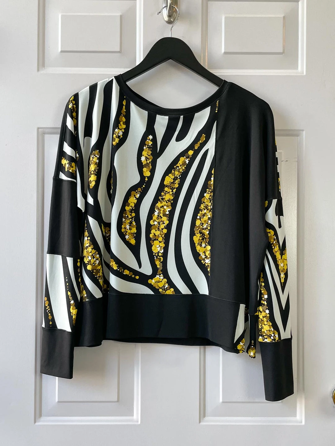 Eva Varro’s Kabuki Top is a signature silhouette that features a color-blocked body in black and multi-color print. Short slightly oversized boxy body with long dropped fitted sleeves. The Charms print features a black and white zebra look print with golden accents.