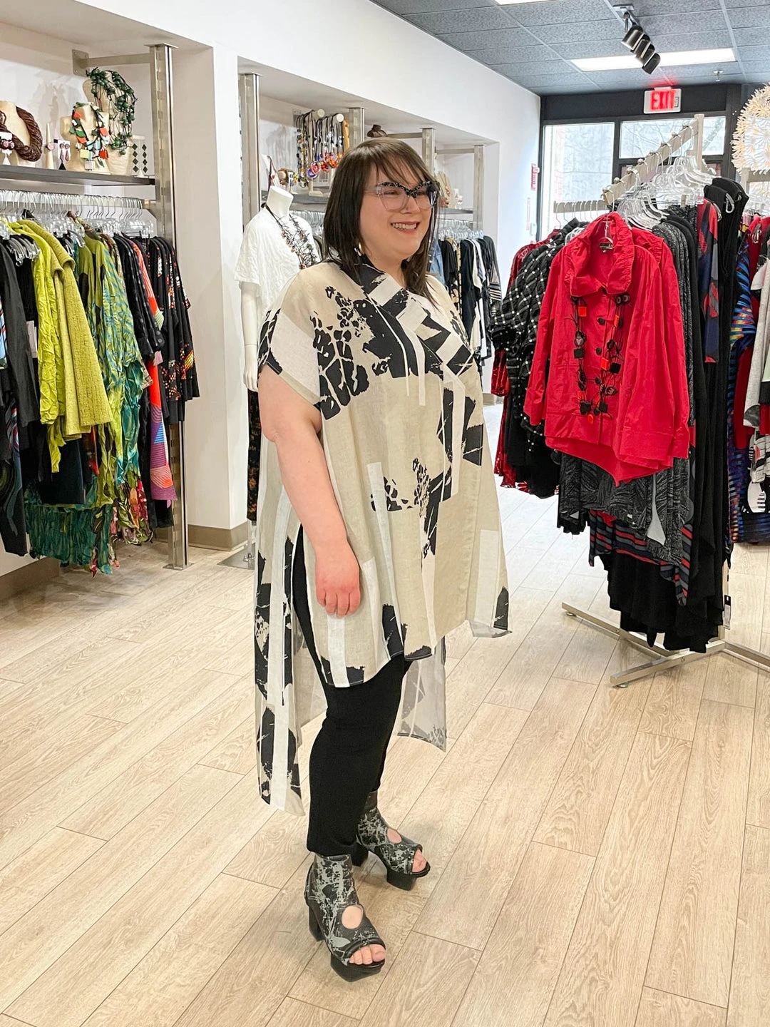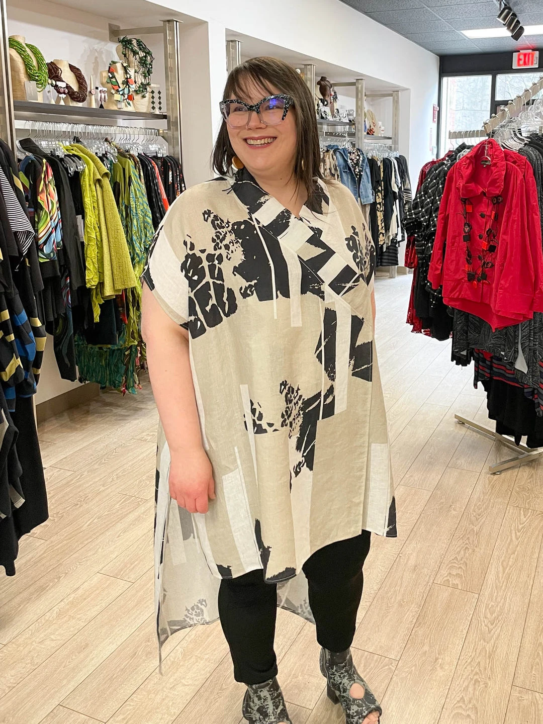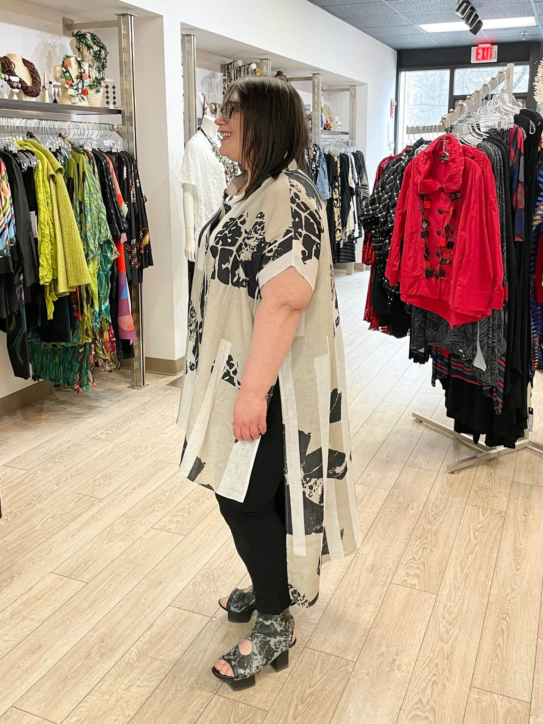 The Frida Tunic from Igor features lightweight linen woven in an art print of black, tan and white. The very generous body features a stunning cross-over v-neckline and short cap sleeve openings. It’s straight silhouette, echos the dramatic stepped high low hemline with side vents.Â