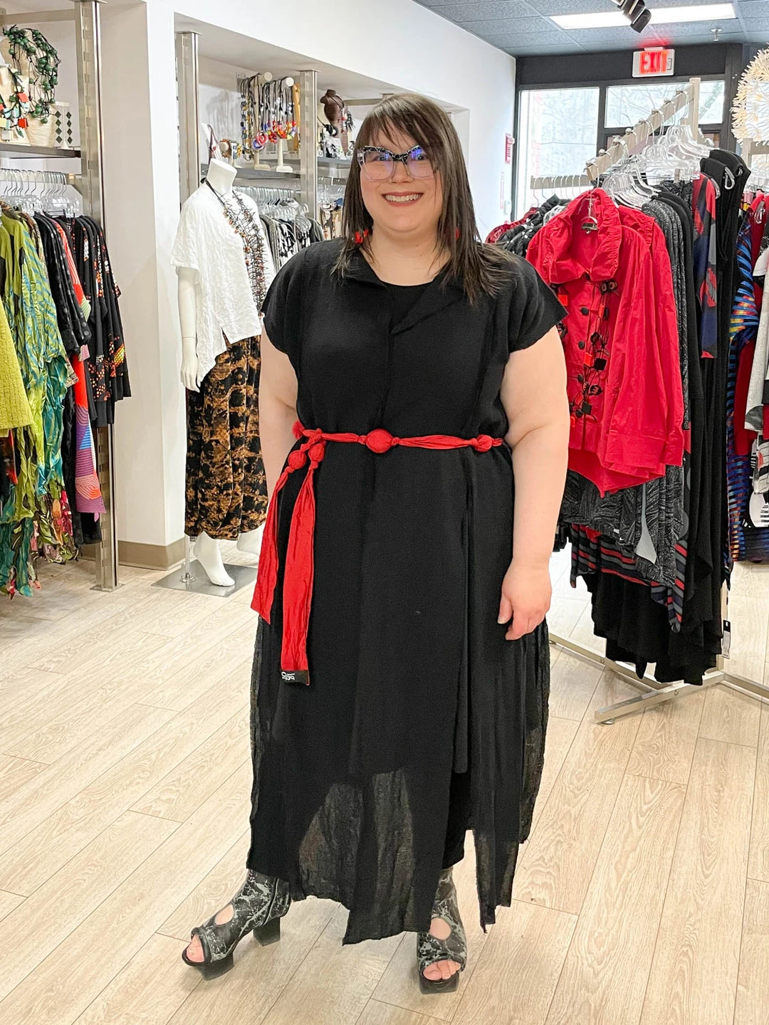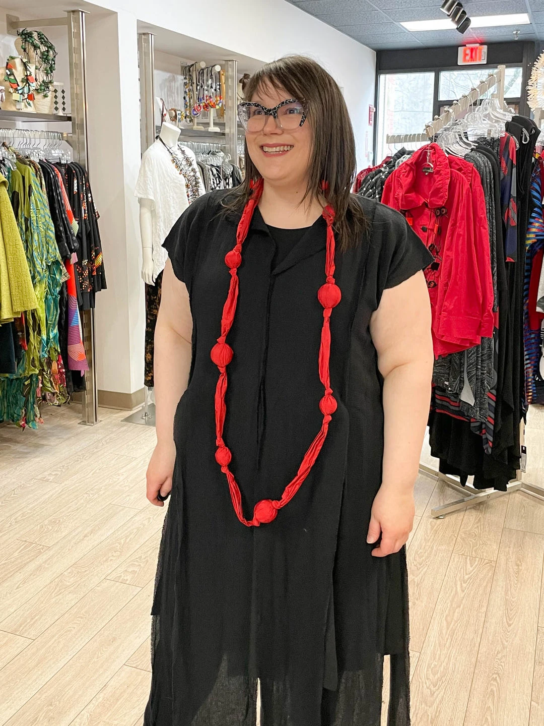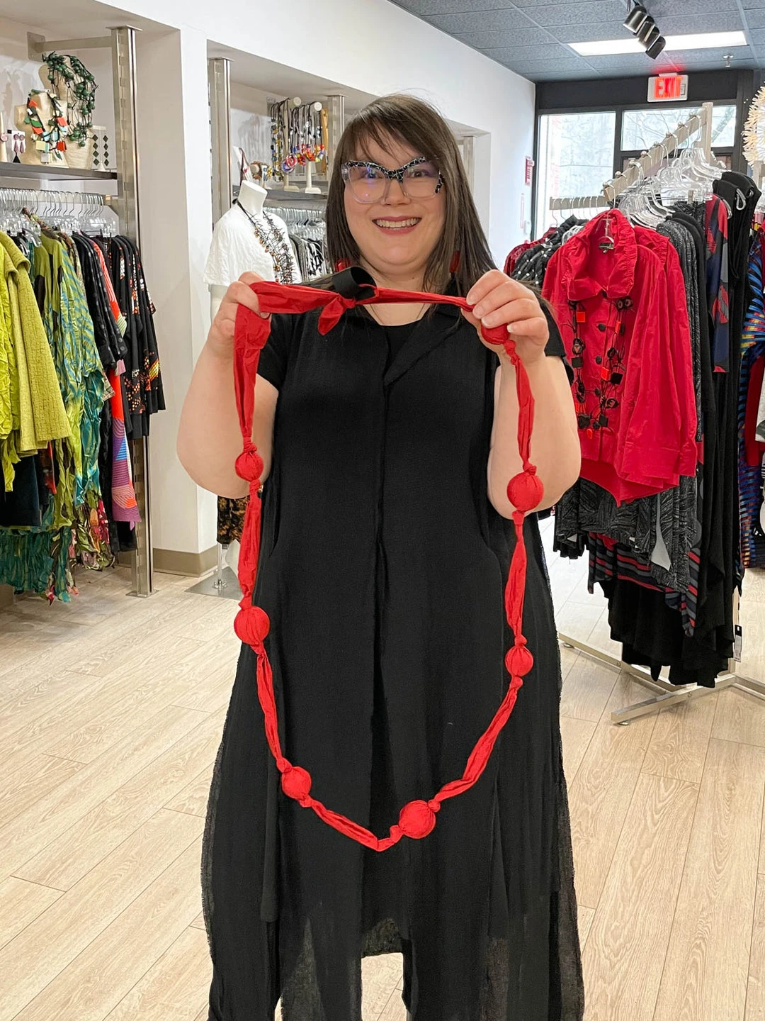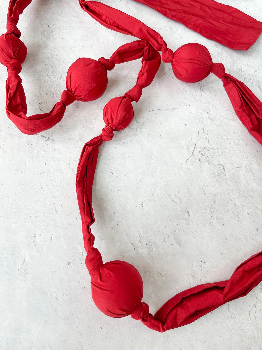 This tie back necklace features fabric covered balls with knots between in taffeta fabric. Can be worn at a belt or necklace – long or doubled up.Â