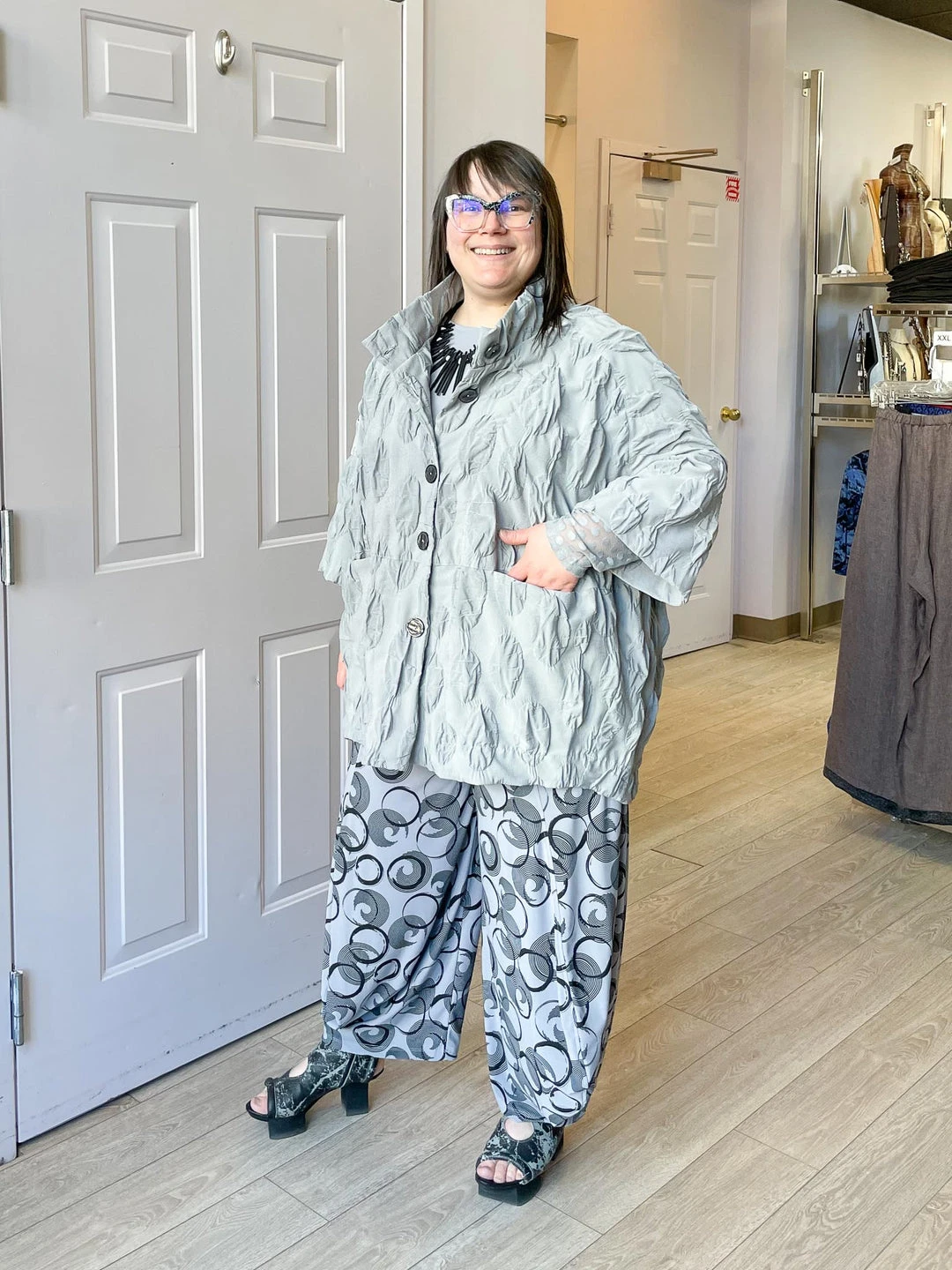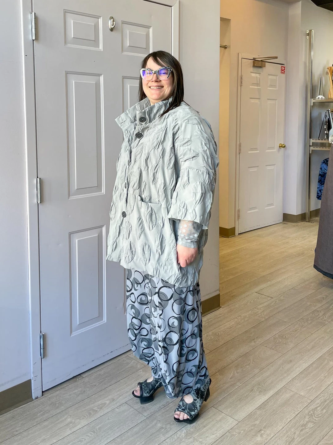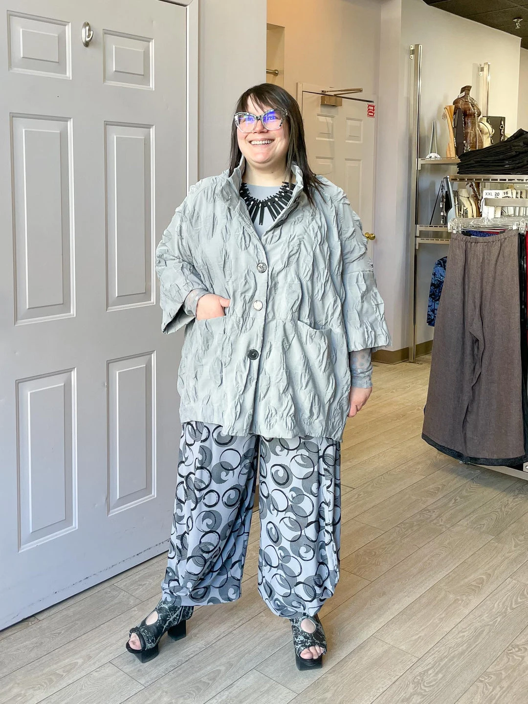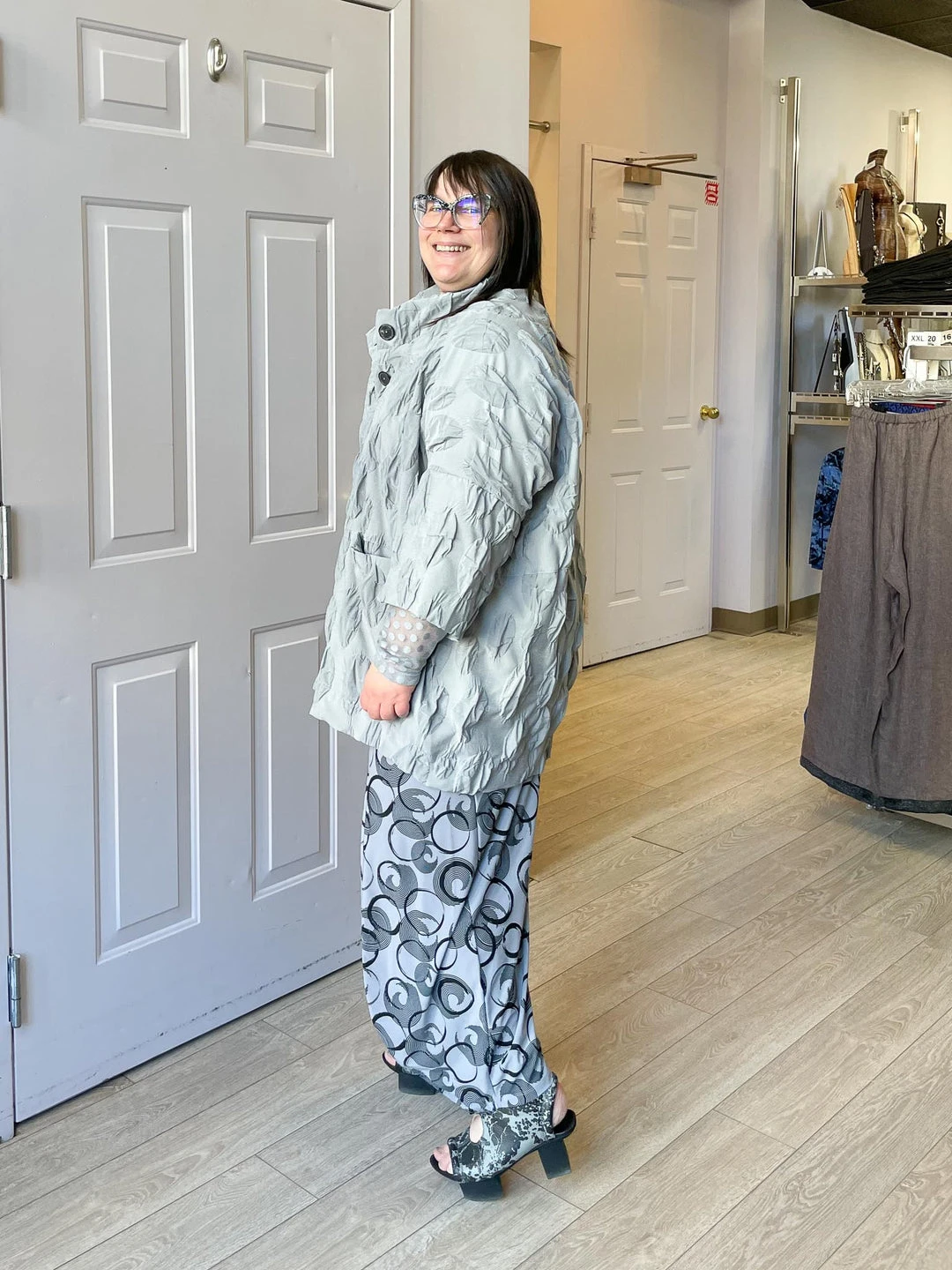 Andrea (size 14/16, 5’3″) wears size L.
