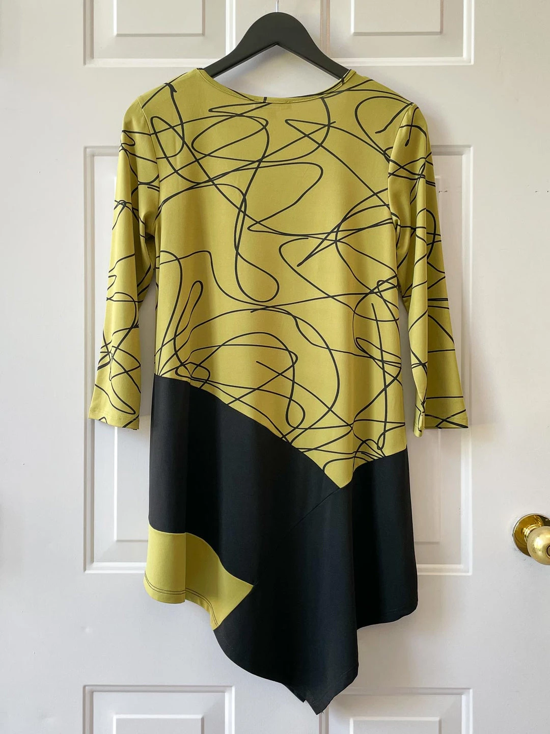 Kozan’s Dash Tunic features an a-line body with paneling detail at bottom. A round neckline, three quarter sleeves and angled asymmetric hemline add to the details. The Script print has a black lines on chartreuse lentil base. Trimmed in black and solid lentil.
