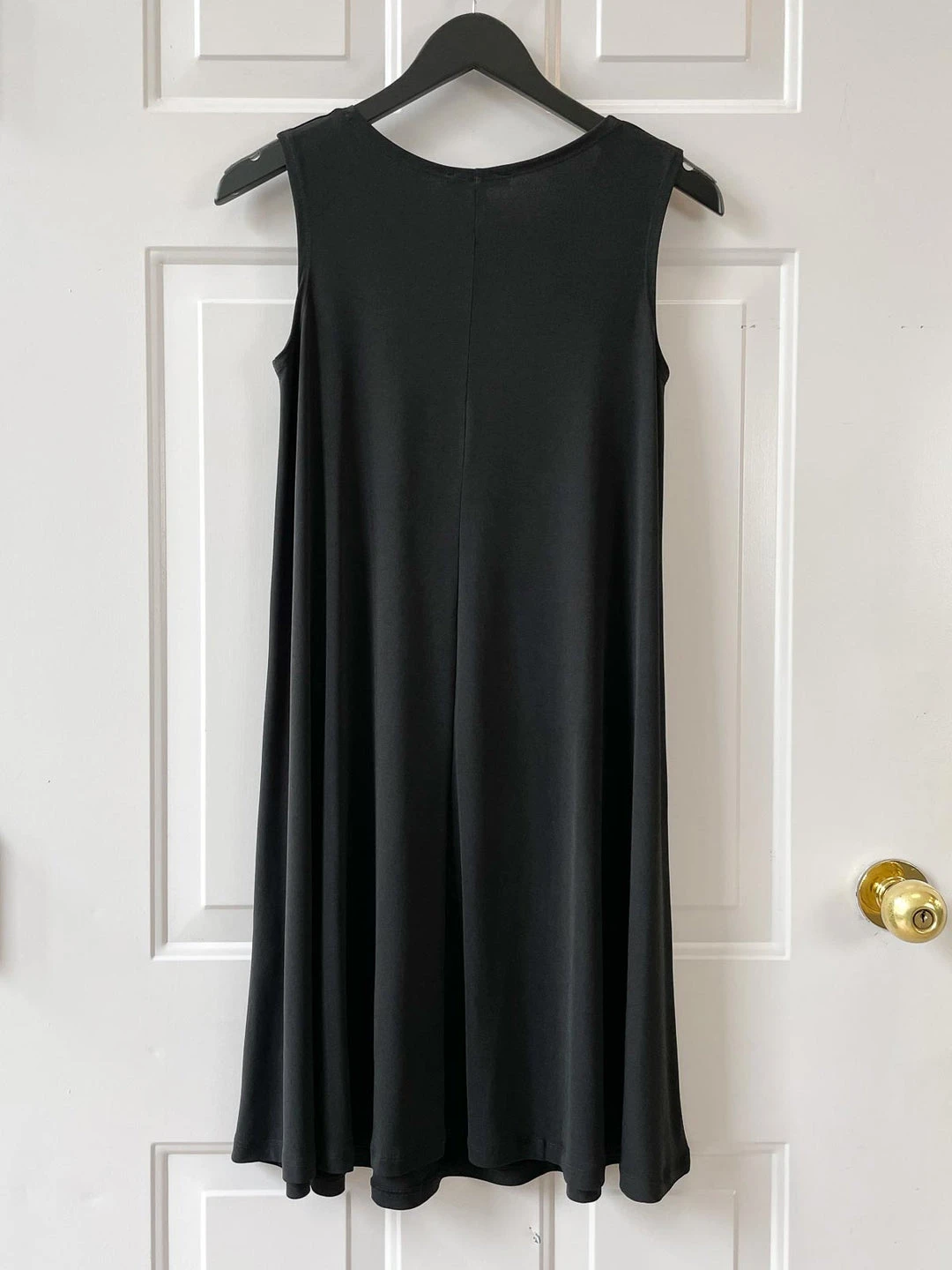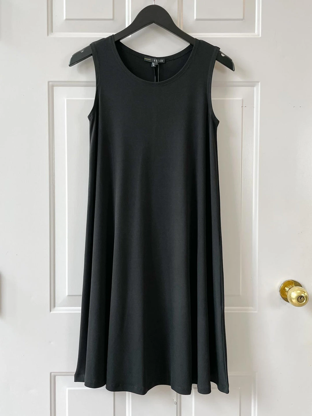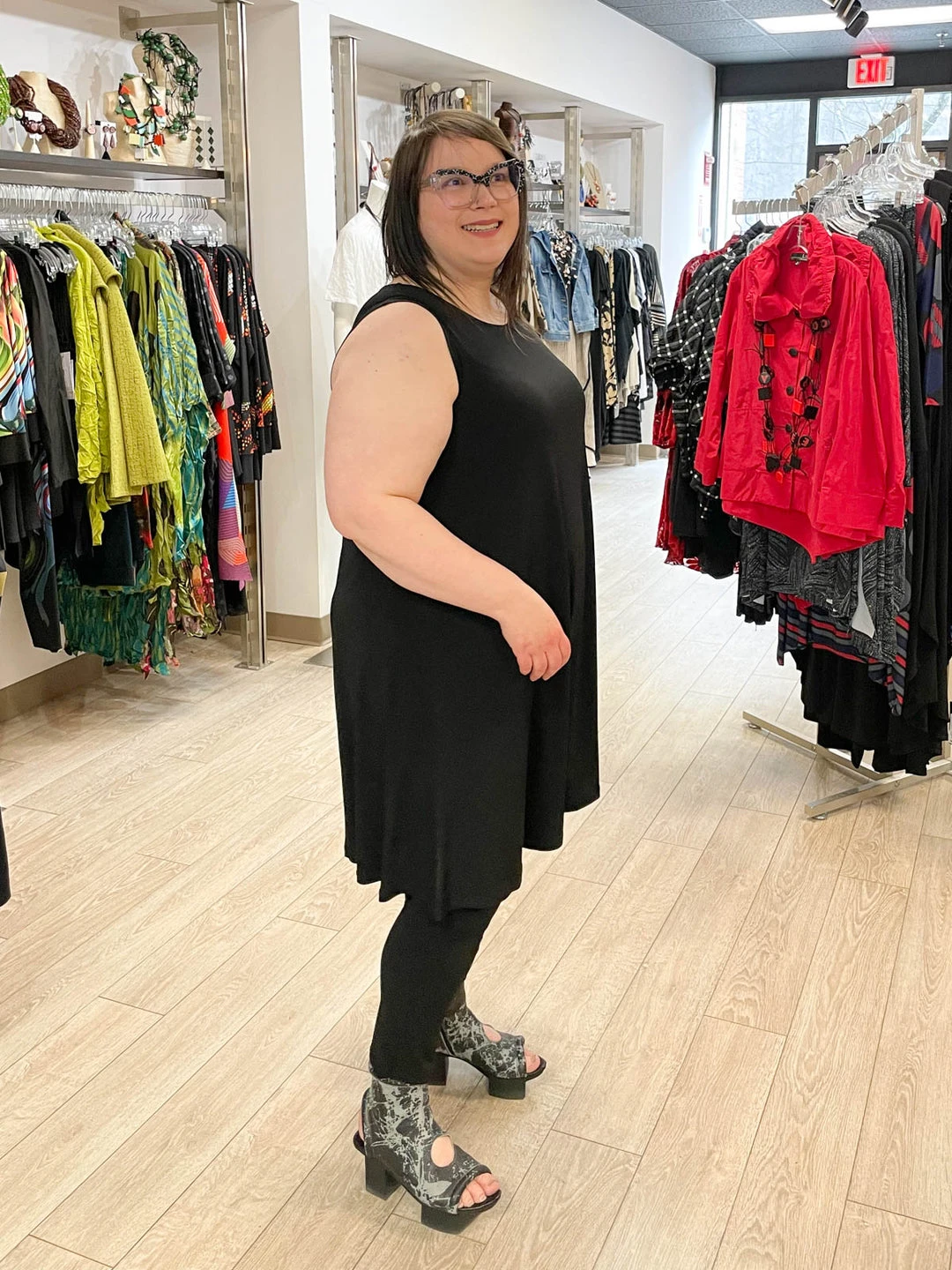 The Dulce Dress is the perfect little black dress, with a full swing silhouette. The sleeveless a-line body has a round neckline and bra-friendly straps. It’s knee length allows it to be a great length for pairing back to a legging, and a beatiful basic to top with and cropped style or topper. Kozan’s Black Vogue fabric is a solid stretch jersey knit, great for travel.