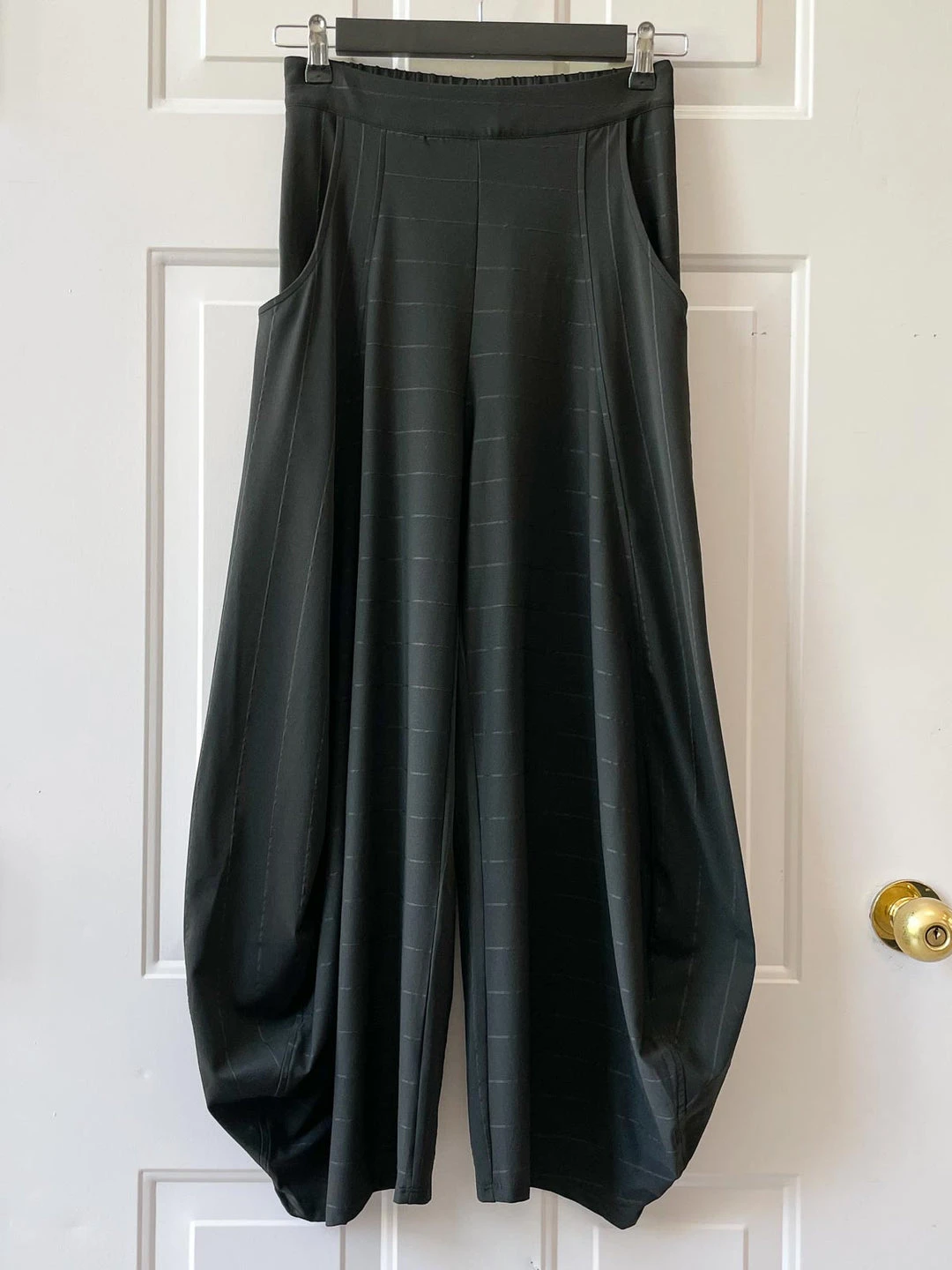 Kozan’s Jade Pant is a beloved style with a ballooned leg silhouette. Seam detail at legs create a full bottom while the horizontal and vertical stripes compliment for a flattering look. The pull on waistband has stretch elastic at back, with pockets at side seams. The Caviar fabric is a black knit with tonal stripe pattern.Â