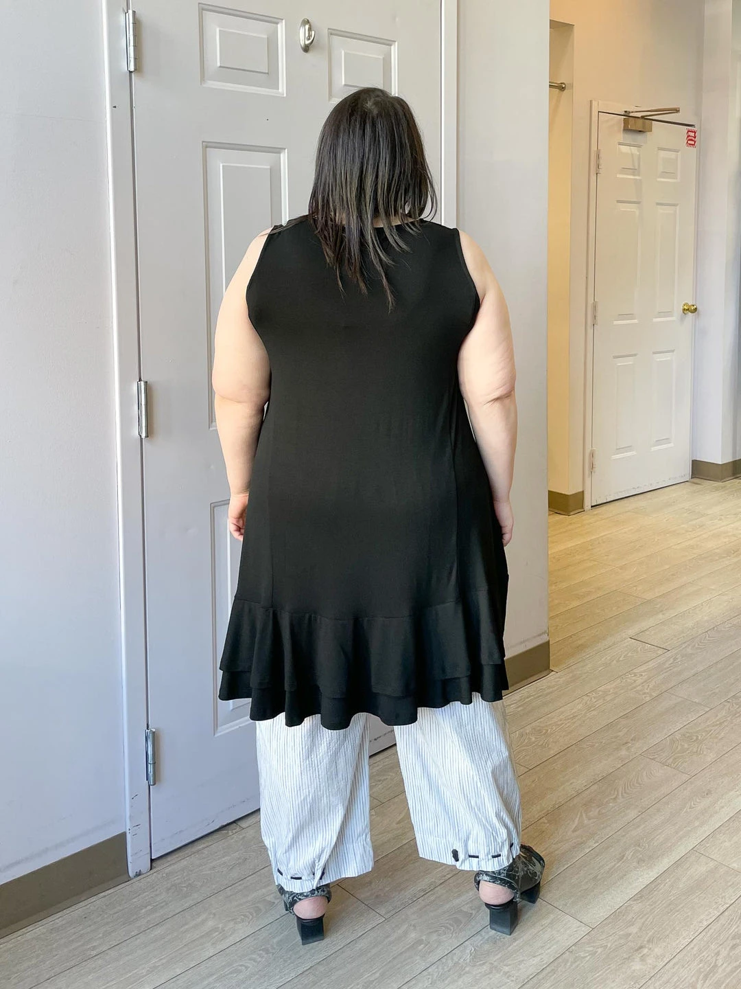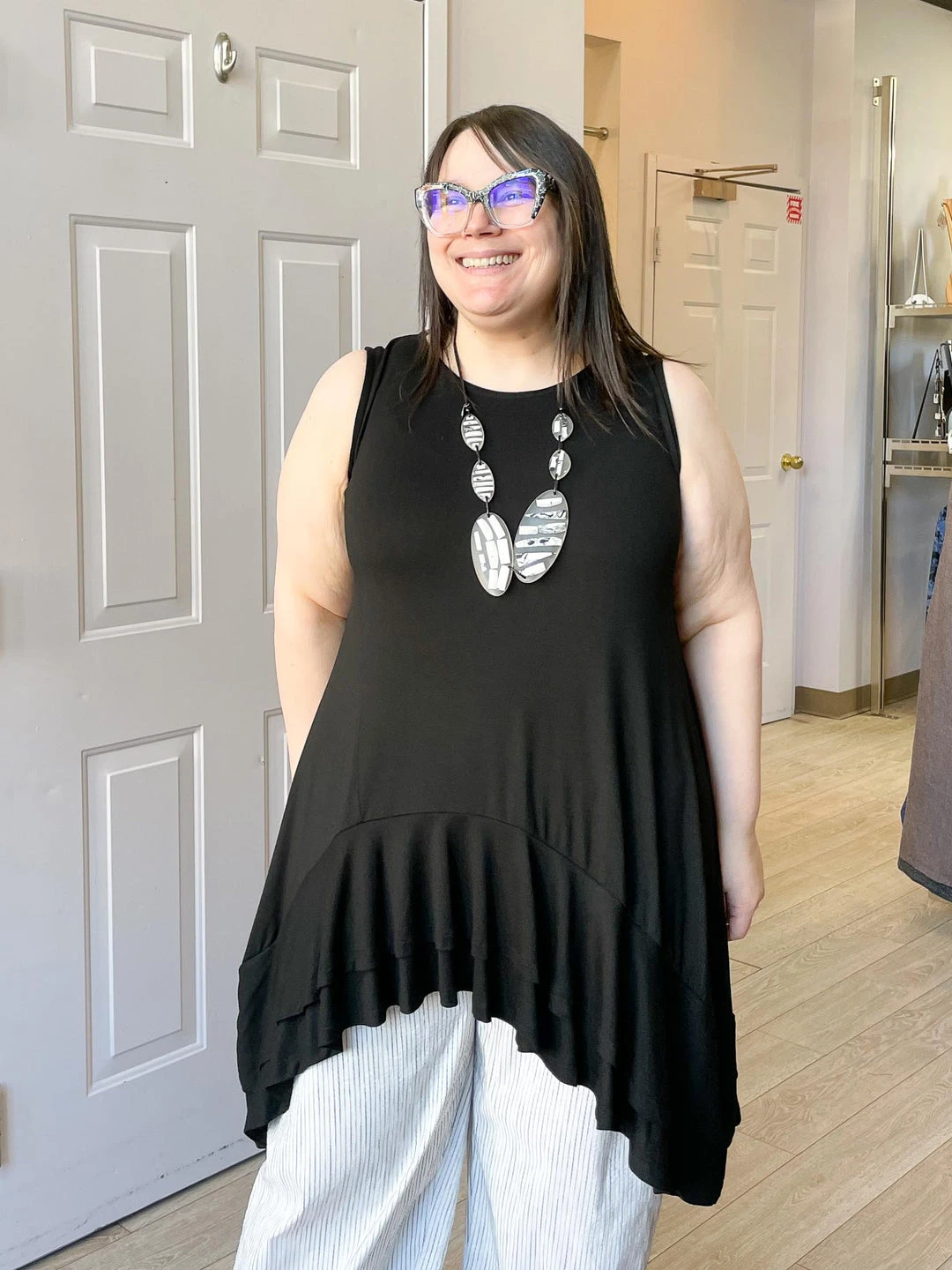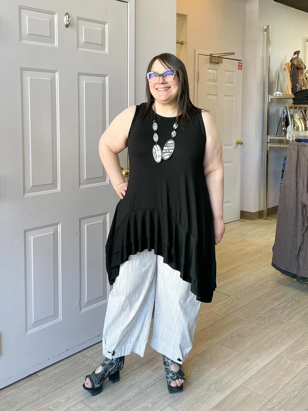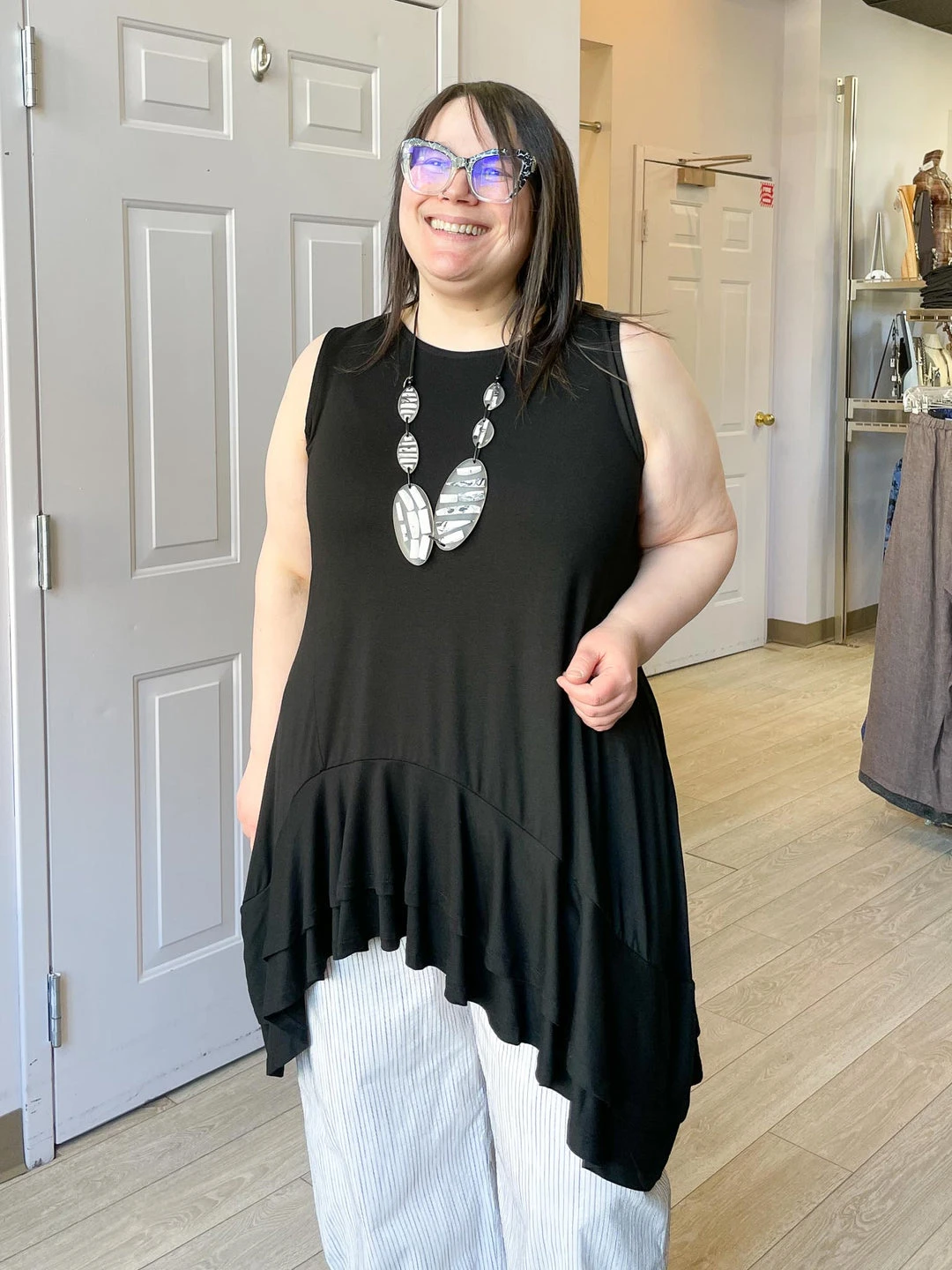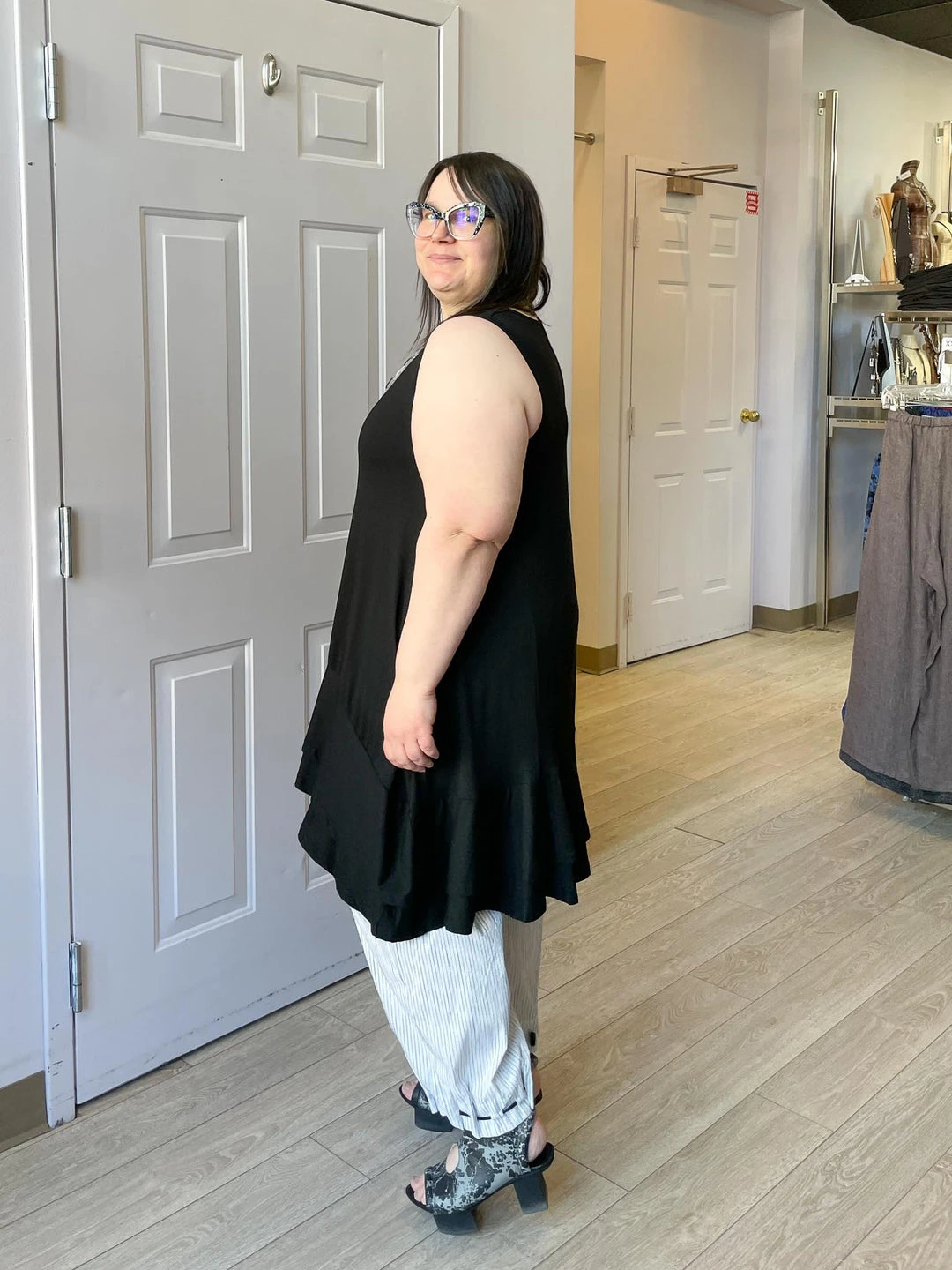Andrea (size 14/16, 5’3″) wears size XL.