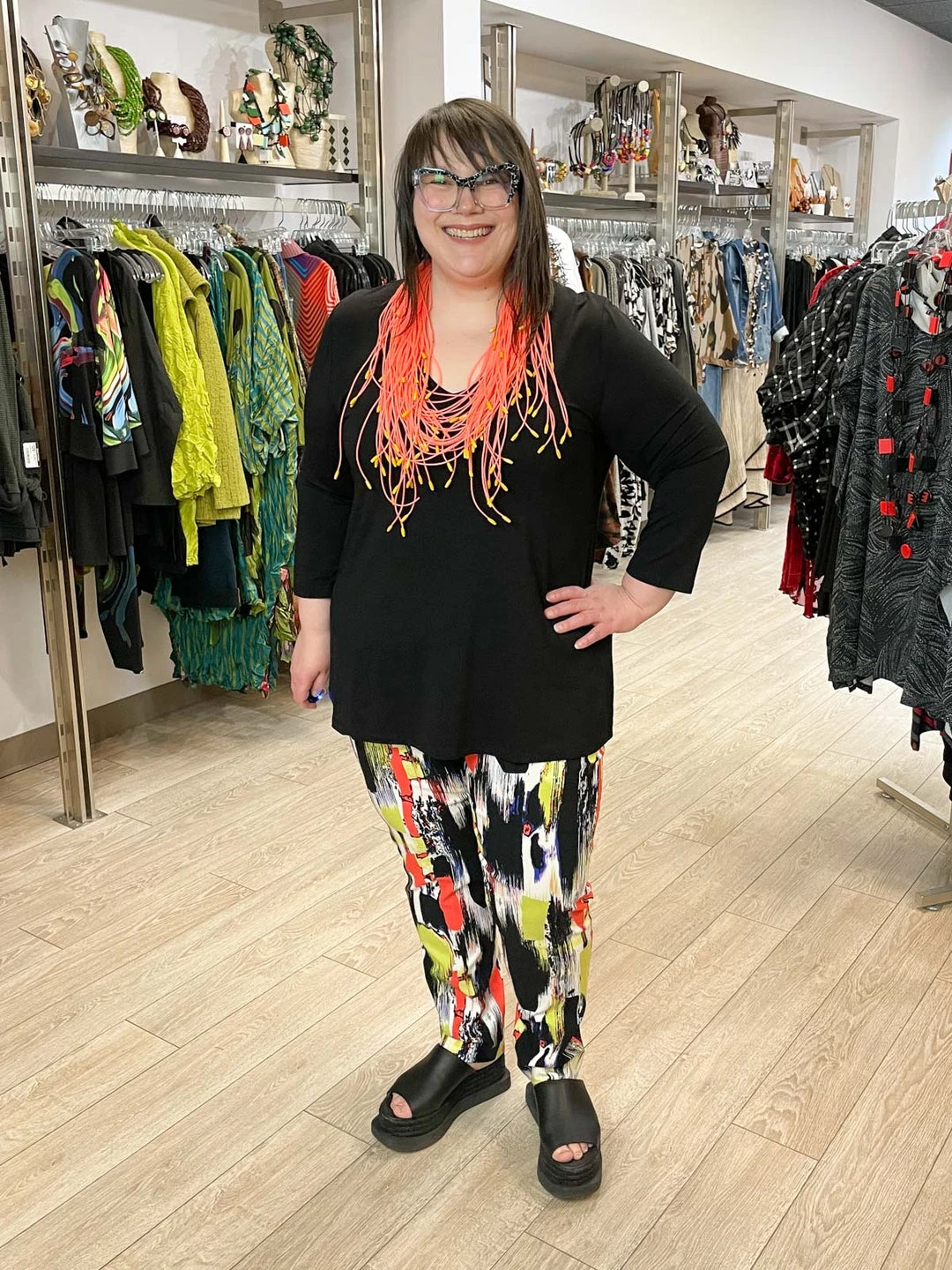 Kozan’s Juliana Top is an easy basic, with a flattering v neckline. The a-line body skims the figure, while three quarter sleeves offer arm coverage. The even hemline makes this the perfect base for layering.