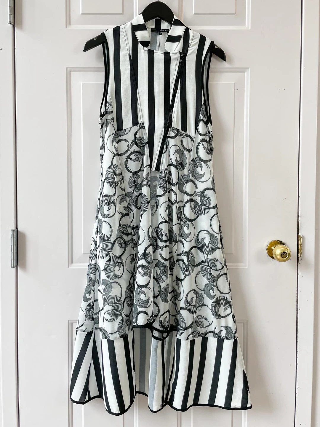 Kozan’s Myla Duster vest is a truly stand out style, with a longer length sleeveless body in a mix of printed mesh and striped crepe. The slim bodice has angled seaming along with an asymmetric zipper to waist. Worn closed the neckline has an open stand up collar, while worn half zipped it’ll show off notched lapels. The front is open from the waist down with a paneled stepped hemline and side seam pockets. The back features unique seaming details, as well. This playful piece is sure to add a little art and a lot of edge to your look! The Rings mix features black and white circle printed mesh with black and white striped lightweight crepe.