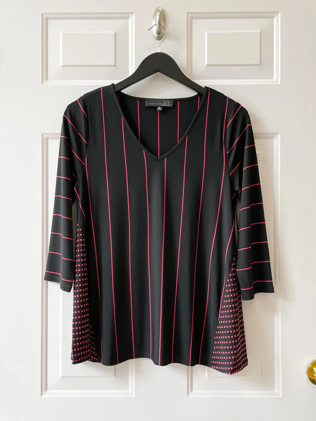 Part of Liv’s Geo Mix Jersey collection, the Maggie Tee is the perfect a-line shape with a flows over the body. Flattering side insets are done in contrast print. A soft v-neckline and three quarter sleeves complete the details.
