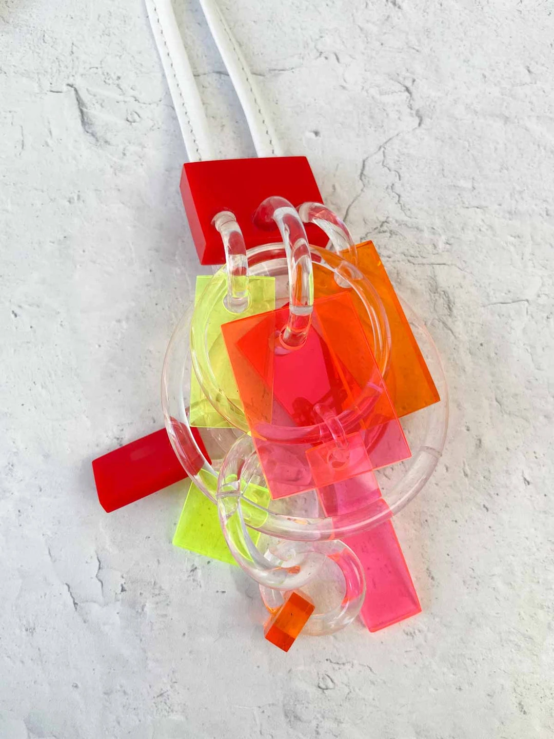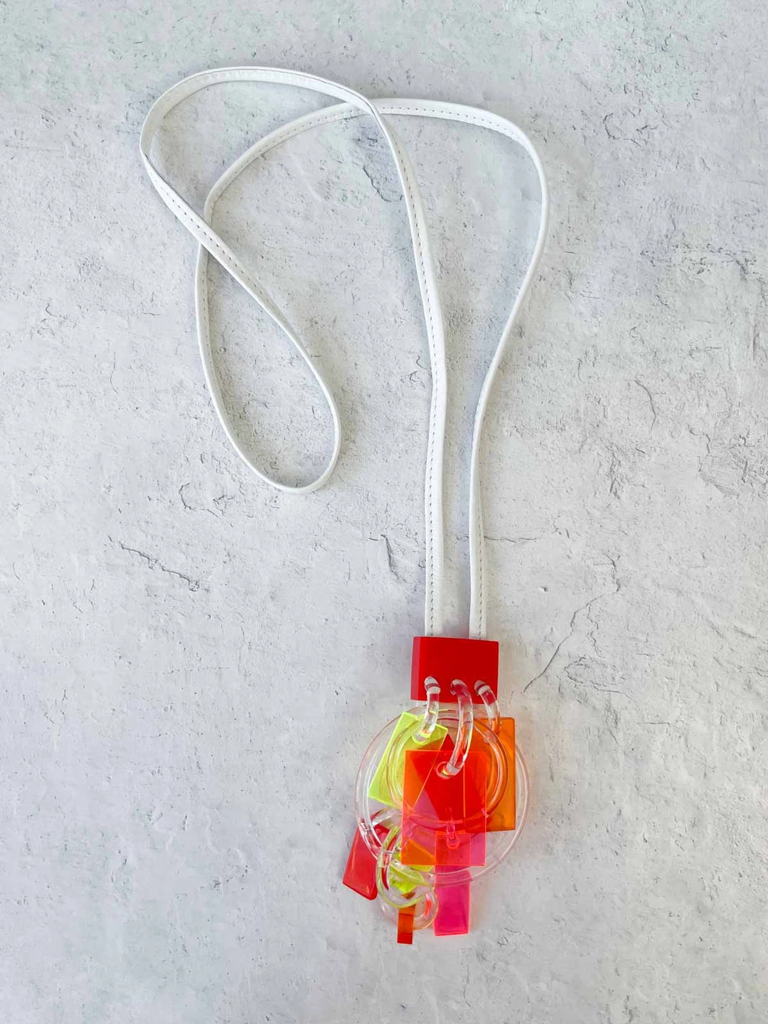 This pendant style features transparent neon drops on clear o-rings on a coordinating red opaque square. The matching leather cord is in a light metallic white-silver.