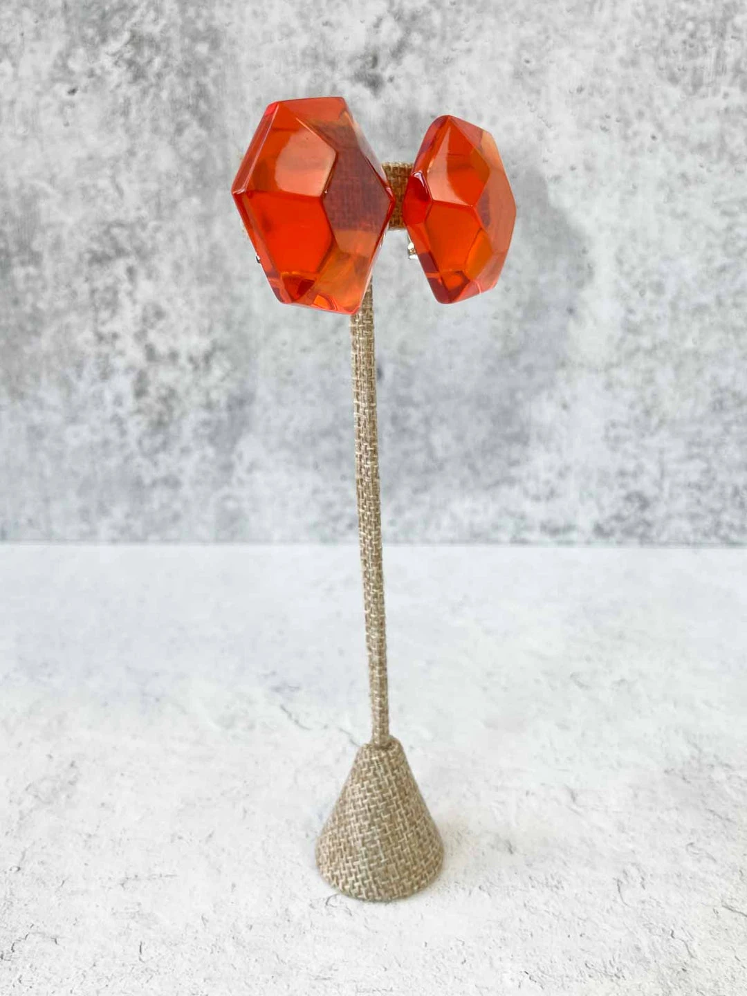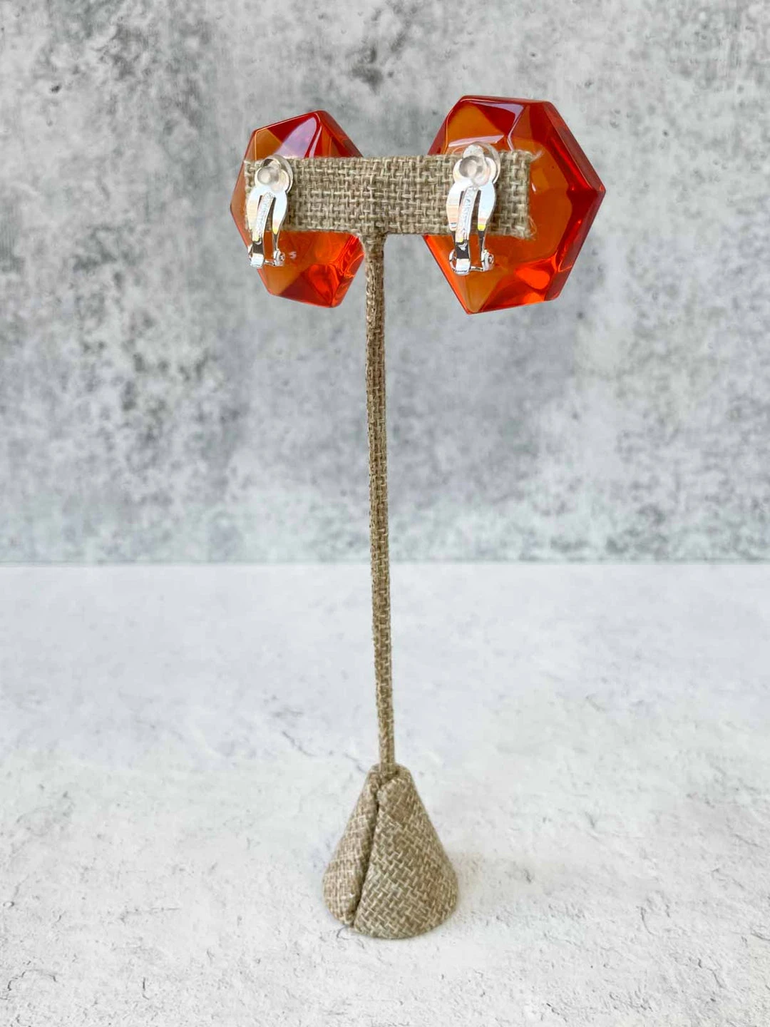 These clip on earrings have a gemstone effect in high shine orange resin with a faceted geometric shape.