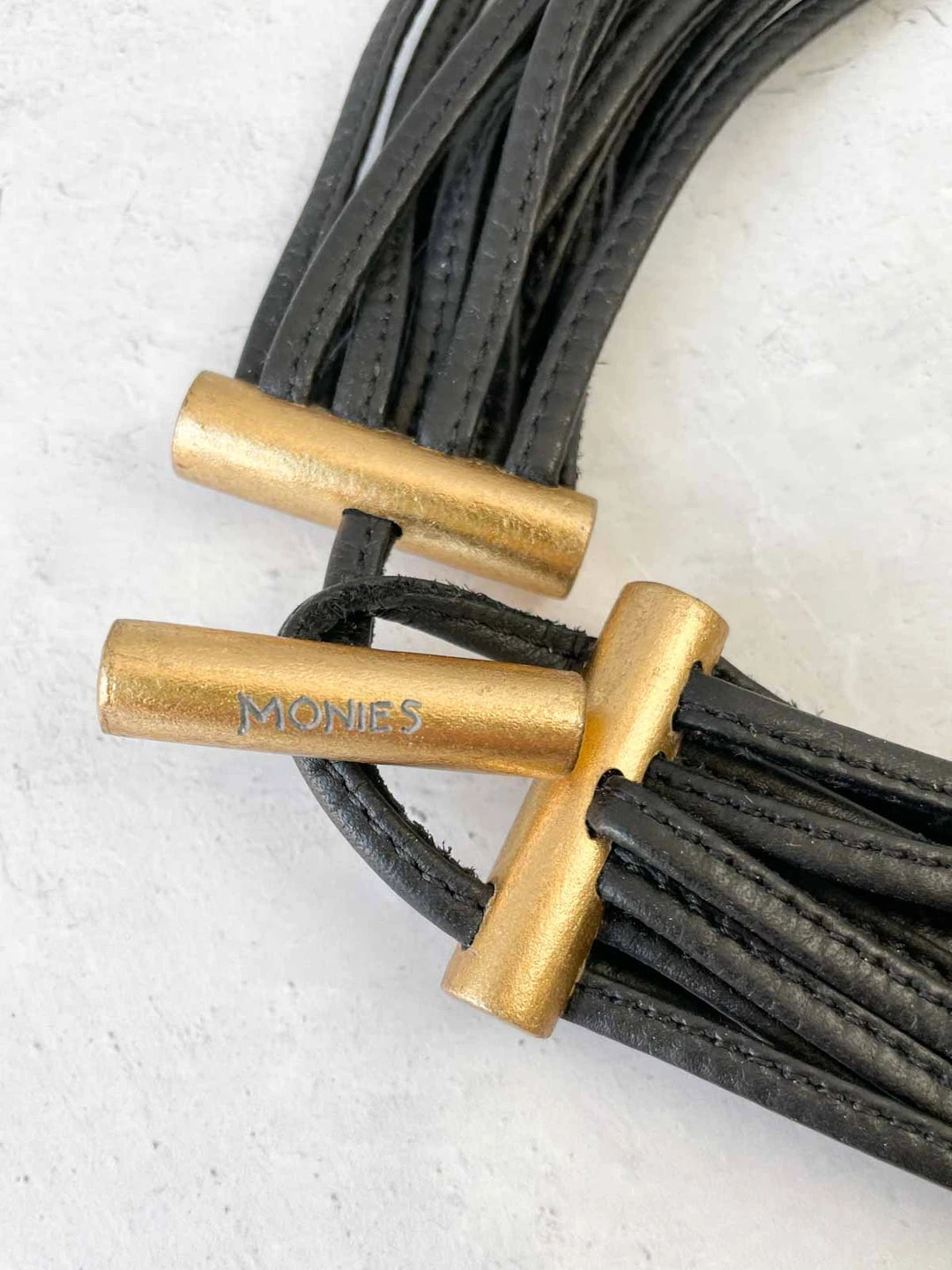 This statement collar is truly stunning with a fourteen strand design of shaped gold foiled tubes on leather. Toggle clasp at back.
