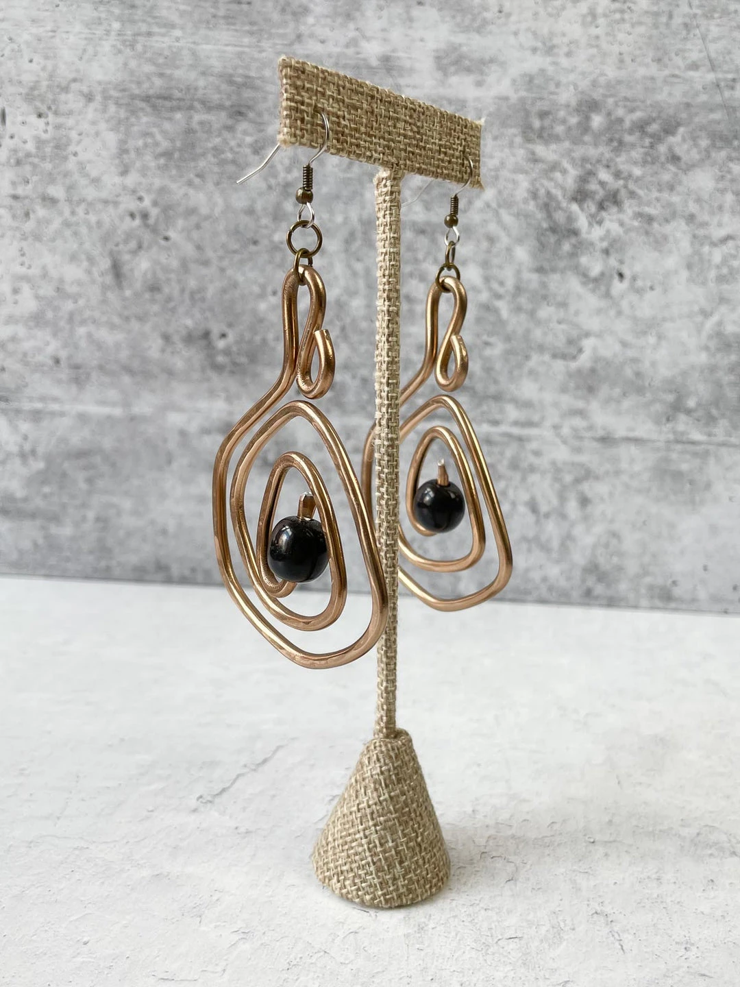 OC’s Laguna earrings are an extra large statement style that feature a flattened aluminum wire shape with black bead at center.