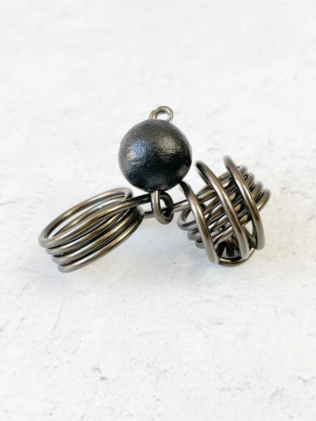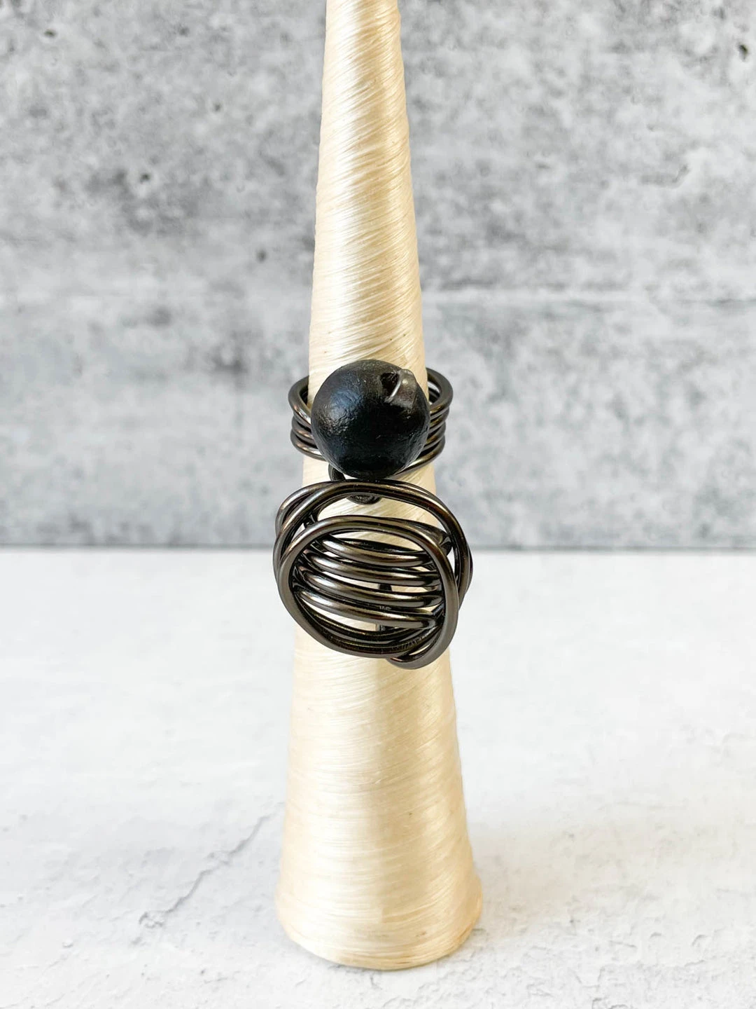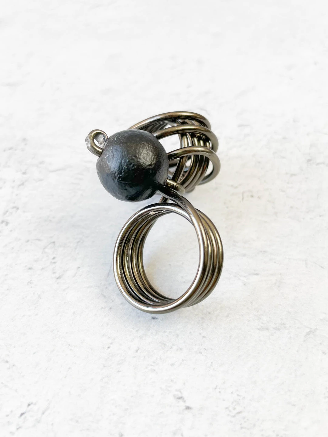 Designs by OC’s Ultra Light collection uses painted paper beads to create unique looks that are also lightweight, for comfortable wear. The Wilma Ring has a small Ultra Light beads with wire wrapped spheres at the face for a funky three-dimensional look. Four wraps of wire create the band.