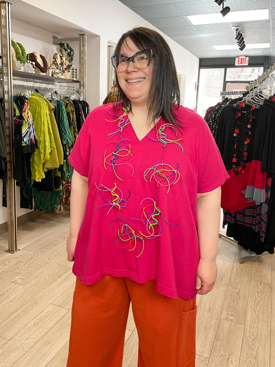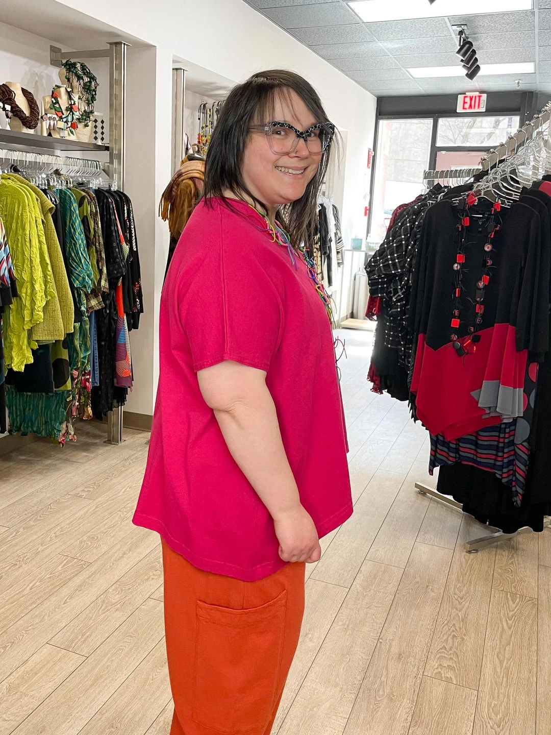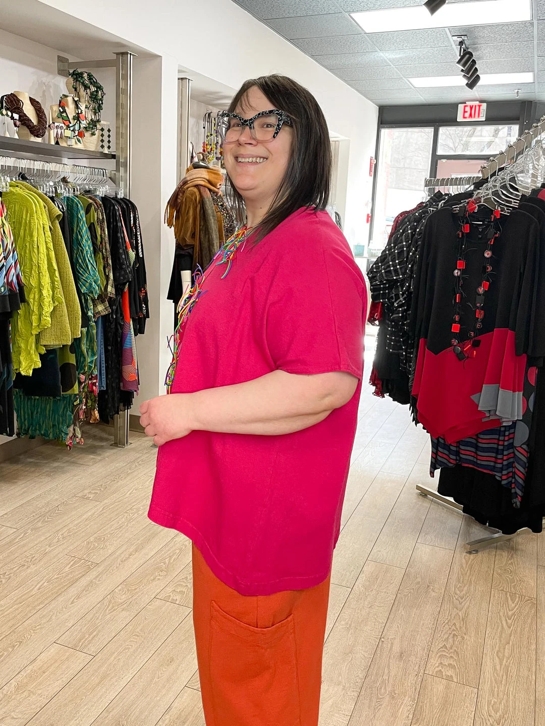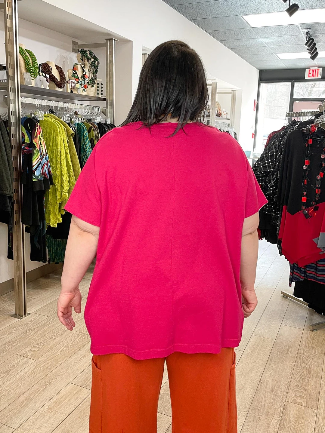 Andrea (14/16, 5’3″) wears size L.