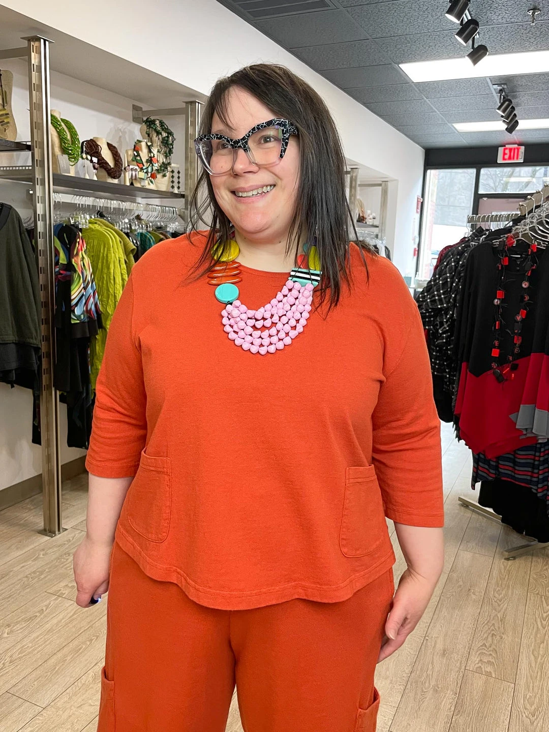 The perfect short top, this boxy style shows off two patch pockets at front, with a round neckline and three quarter sleeves that are slightly dropped.