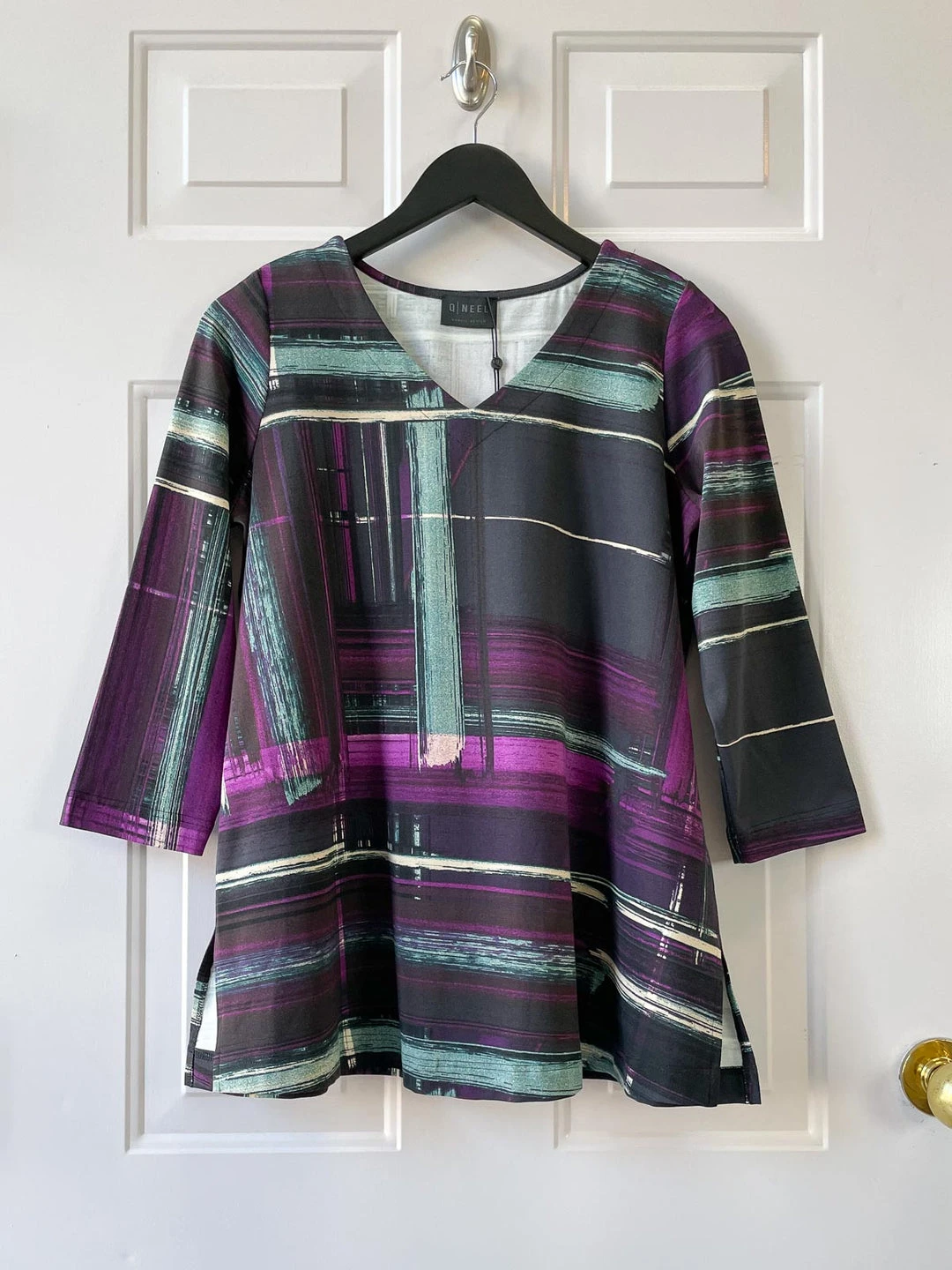 In a beautiful brush stroke print of magenta and teal hues on a base of dark blue-grey, this v neck style stands out with an a-line body, three quarter sleeves and side vents at the softly curved hemline.