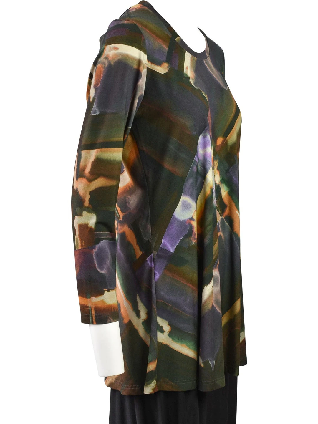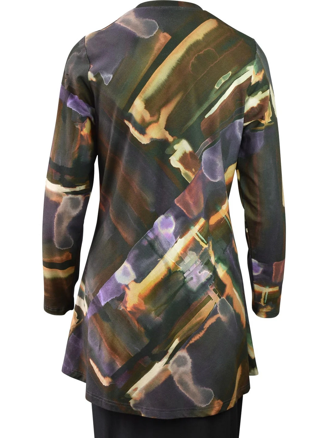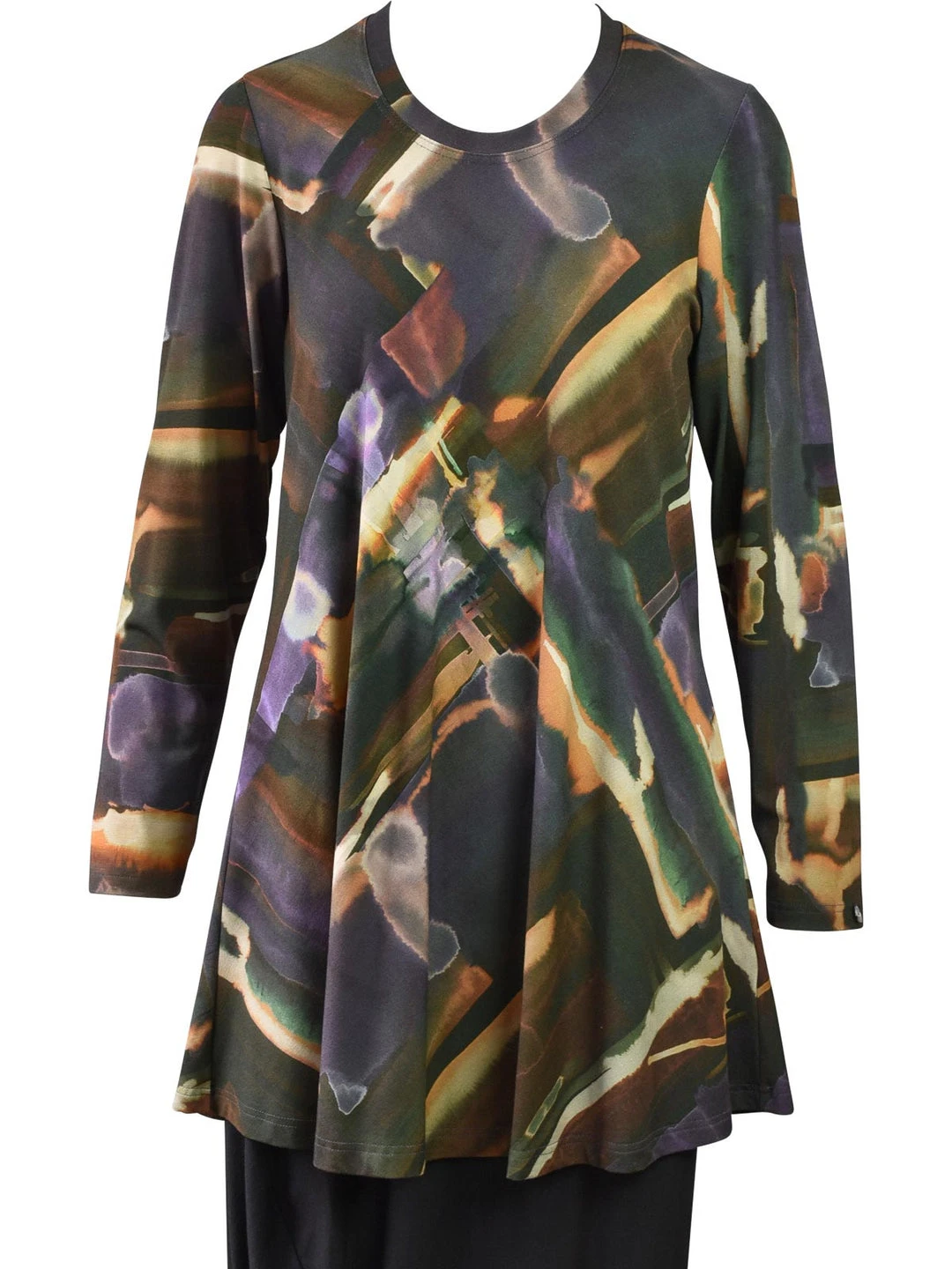 Q’Neel’s prints stand out and this one catches the eye with rich fall hues of browns, plums and oranges. This long sleeve tunic has a round line and slim a-line body with even hemline.