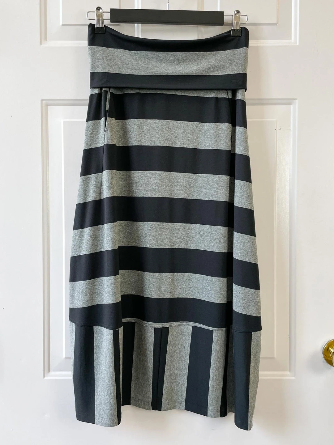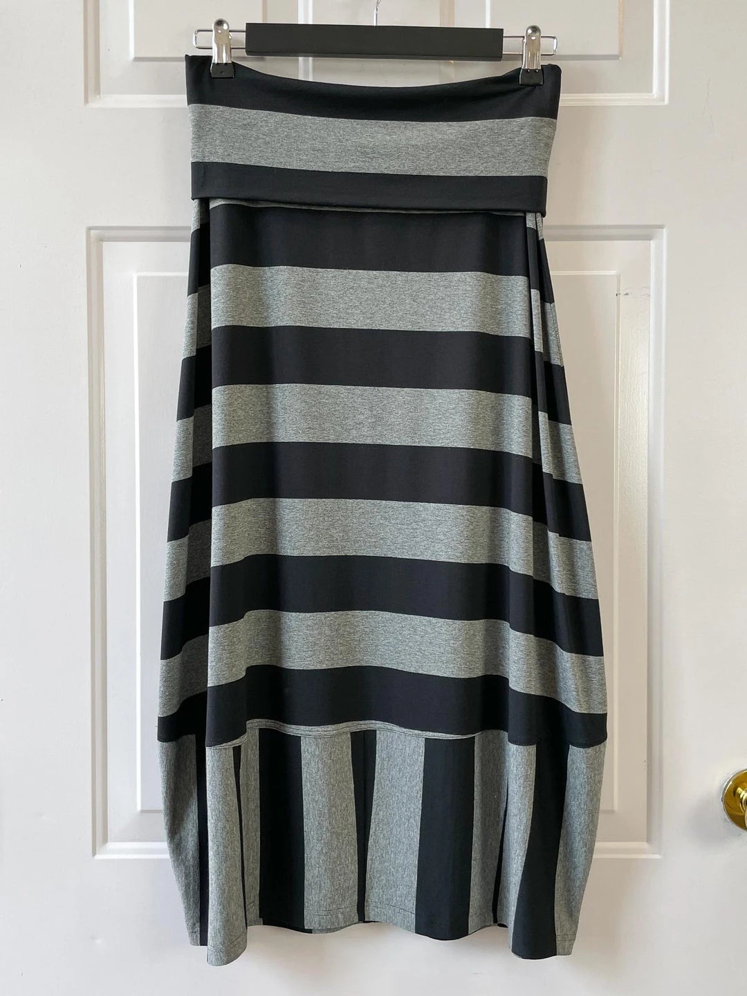 In wide stripes of black and heather grey, this midi skirt features a lantern shape paneled hemline. The fold over waist has slant pockets at side seams.