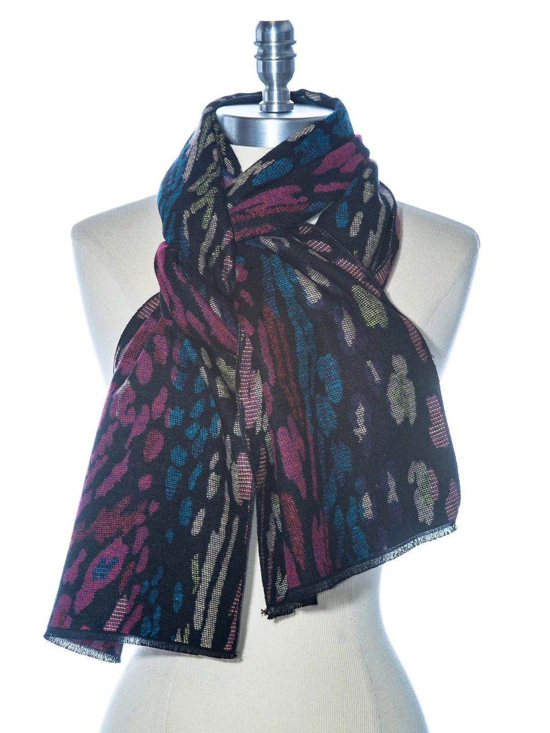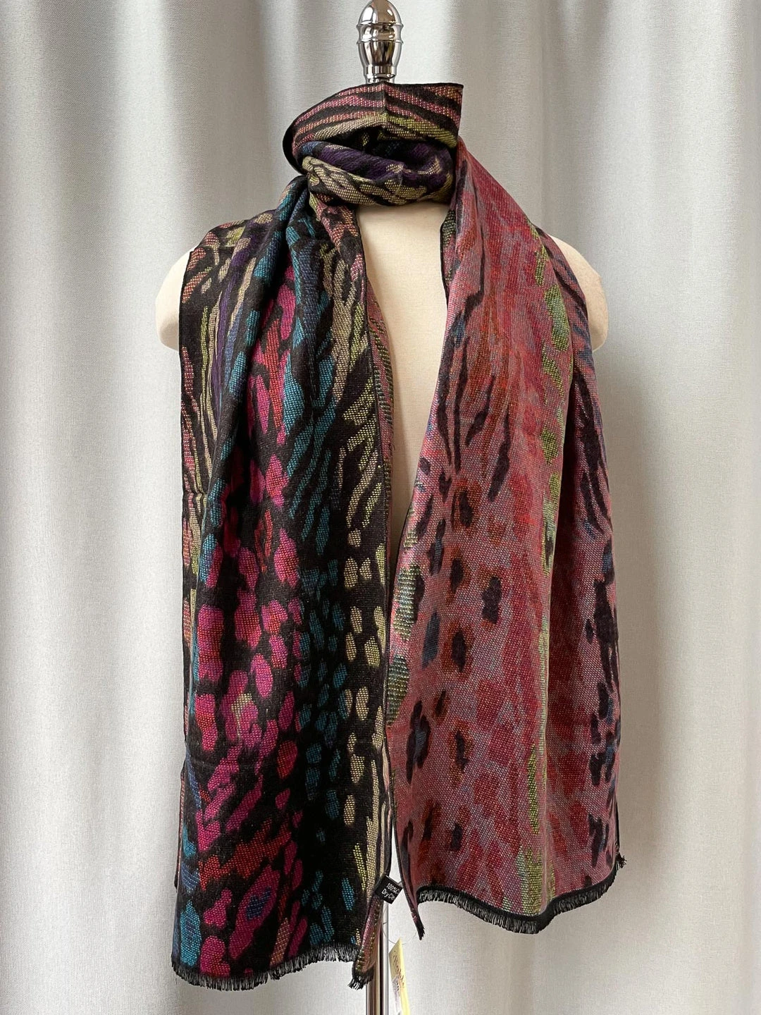 This long rectangular scarf shows off a reversible art pattern in soft brushed cashmere. Ends have 1/4″ black fringe. The perfect accessory for any fall or winter ensemble!