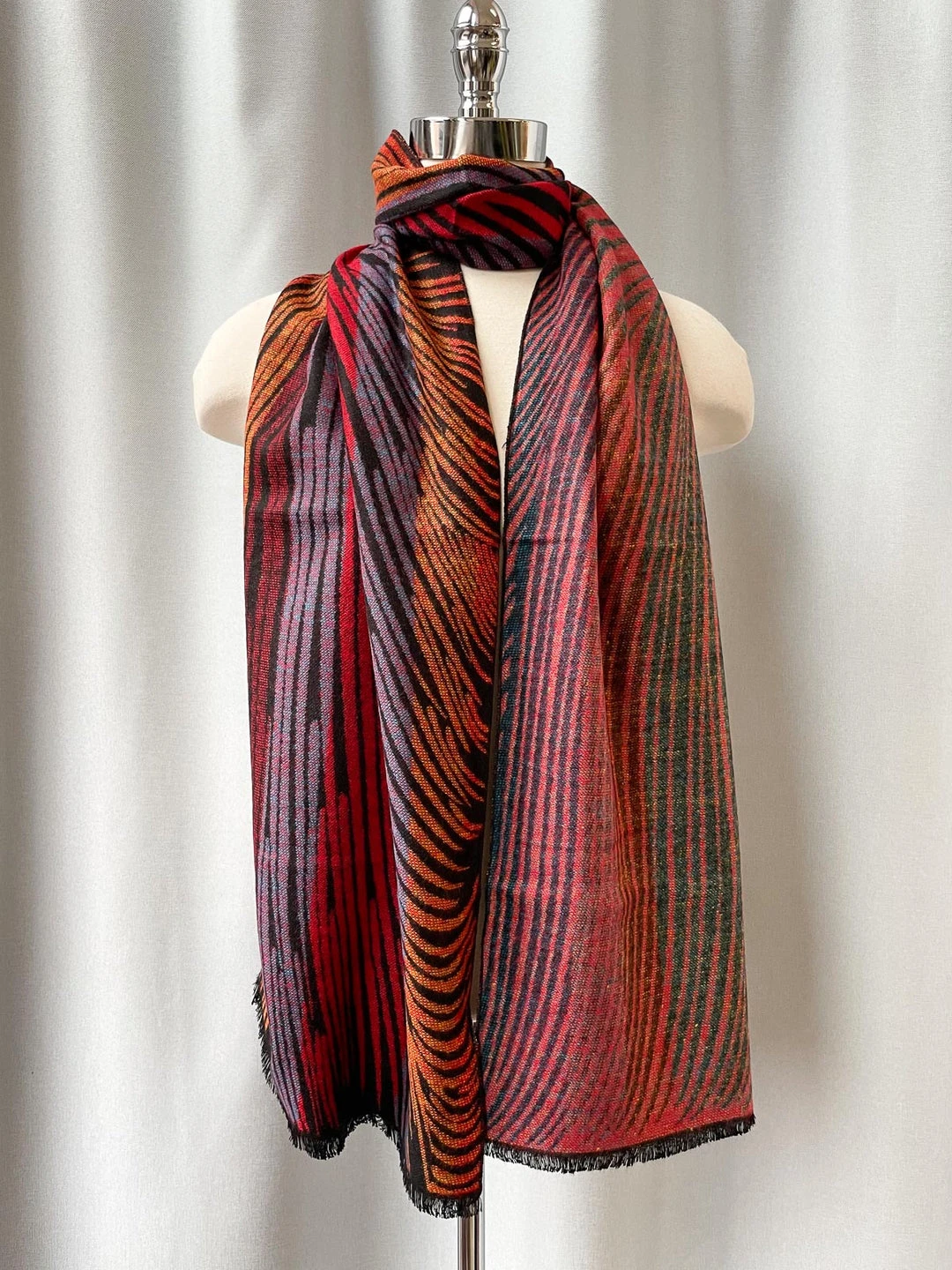 This long rectangular scarf shows off a reversible art pattern in soft brushed cashmere. Ends have 1/4″ black fringe. The perfect accessory for any fall or winter ensemble!