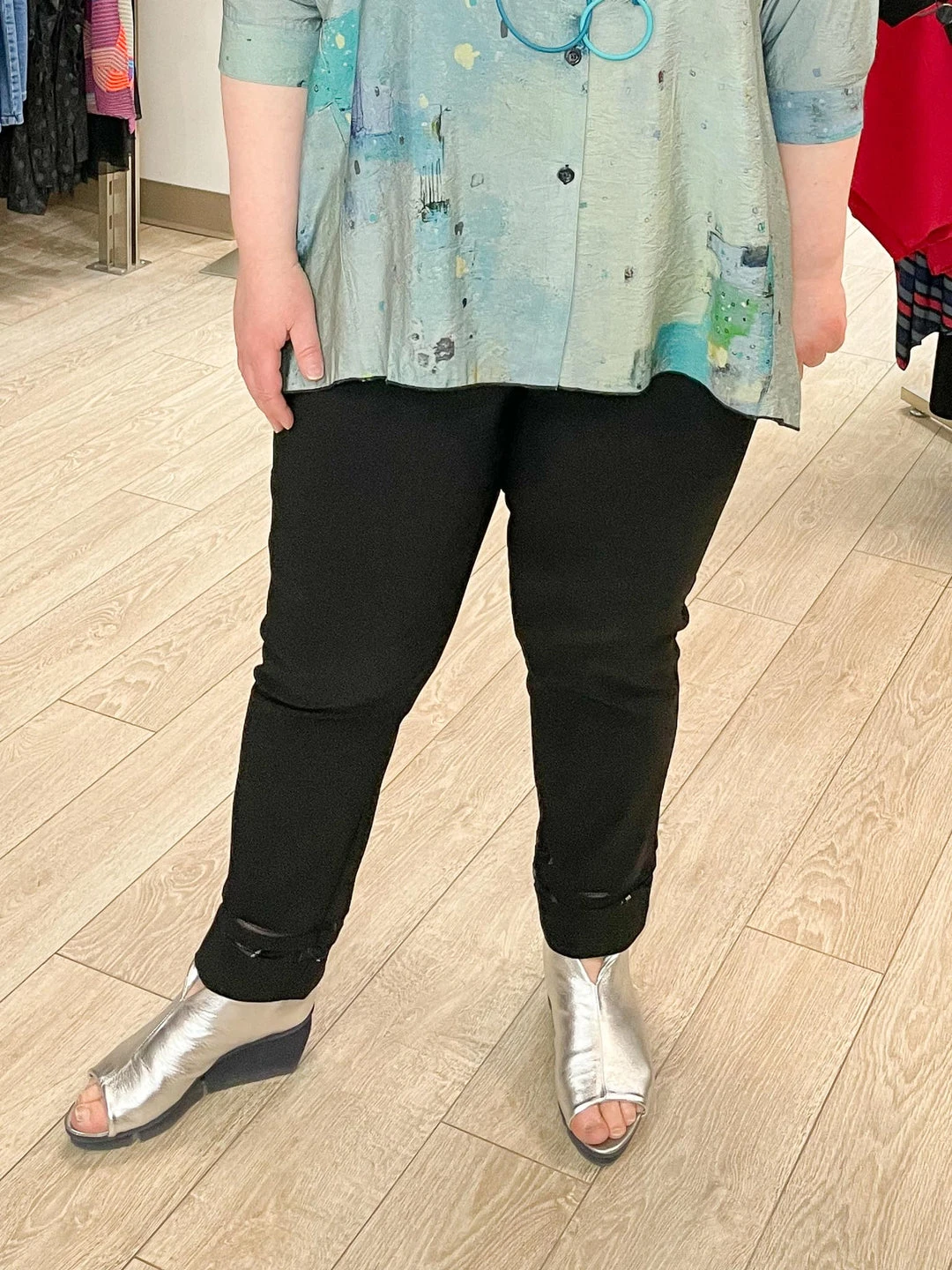 Robell’s signature bengaline stretch is perfect for a little bit of structure. This contempoary basic has a cropped length with slim legs that feature mesh insets at hemline. A clean pull-on waist with front darts and vertical seams at the back of legs offer a flattering silhouette.