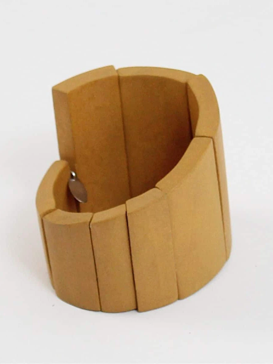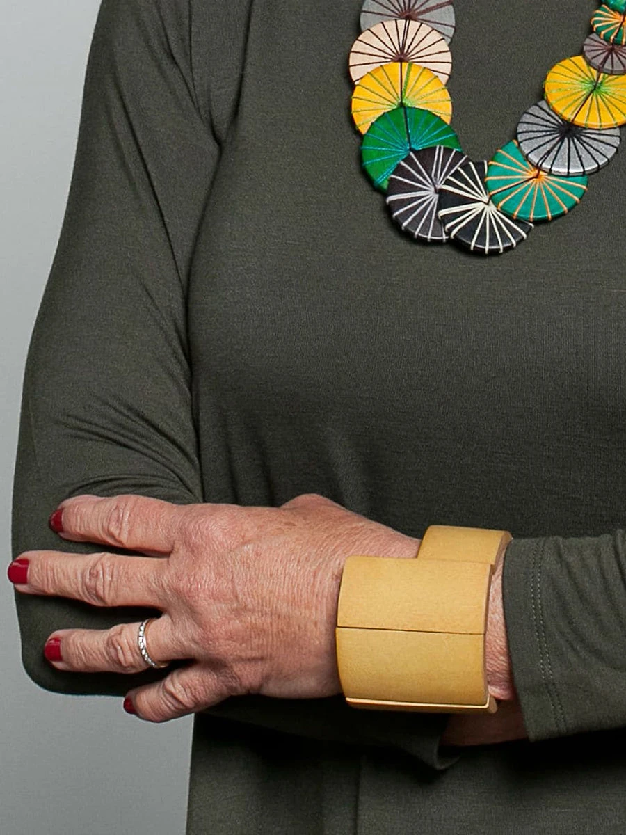 This round wooden bangle is easy to wear with other pieces or by itself! The ascending yellow wooden pieces are strung on a stretch cord which makes it a one size fits most bracelet! Pair with a coordinating necklace an extra bold look!