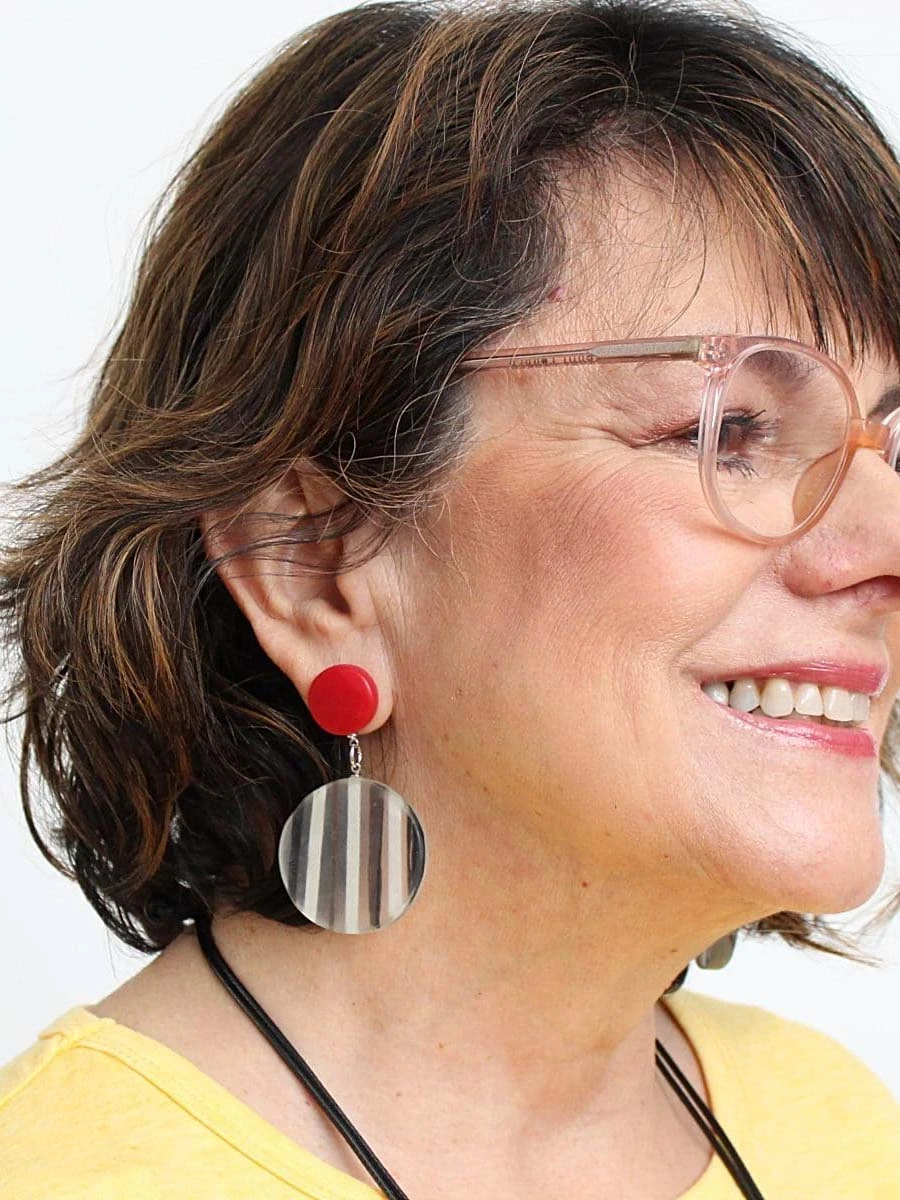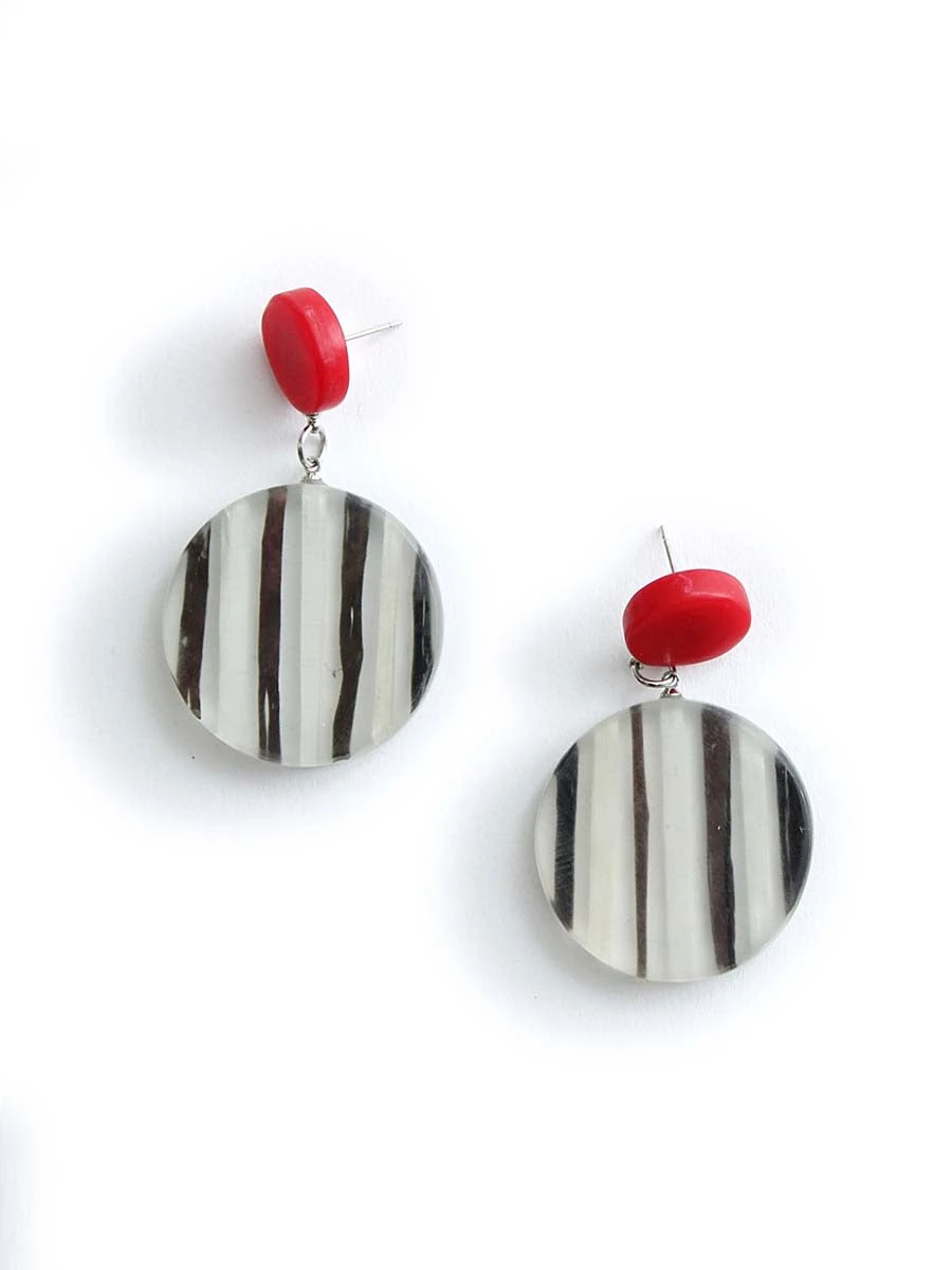 These chic earrings are handmade of translucent resin and hang in a round shape. Detailed with raffia stripes in coordinating colors that dangle from a black stud for added dimension. Very light but stunning, these beautiful earrings will make a statement with any outfit!