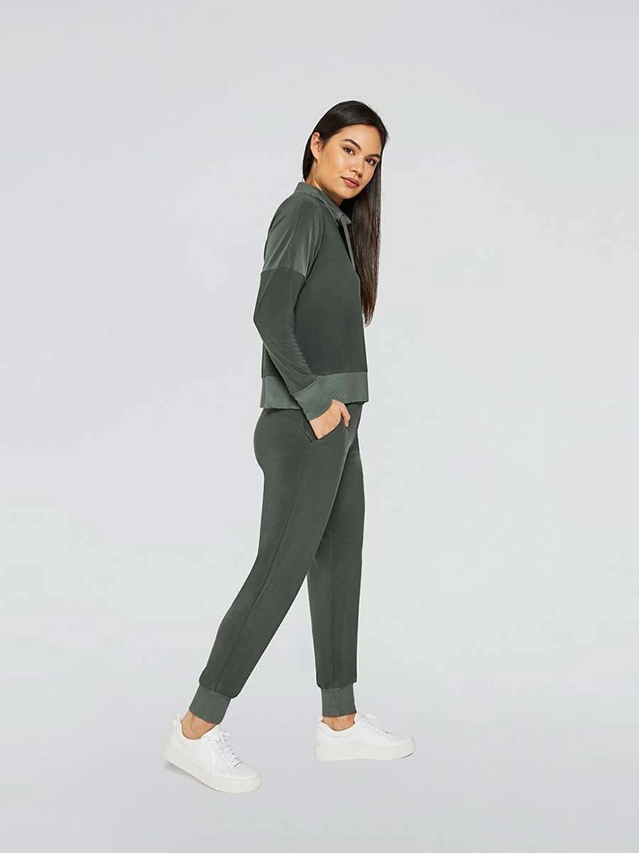 Sympli’s “Motion” capsule features sporty styles with ribbed knit accents. The cozy Motion Sweatshirt features ribbed knit at the hemline, cuffs and neckline. With a relaxed boxy body, it has an even hemline, dropped dolman set long sleeves and a relaxed turtleneck with ribbon drawstring detail. Pair back to the Motion Trim Cuff Jogger for a casual yet chic ensemble.