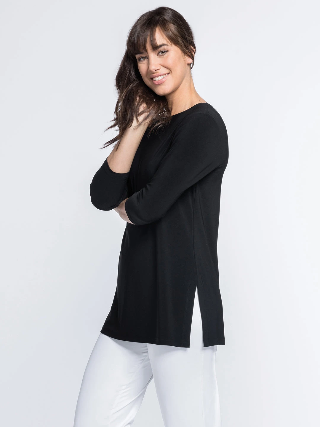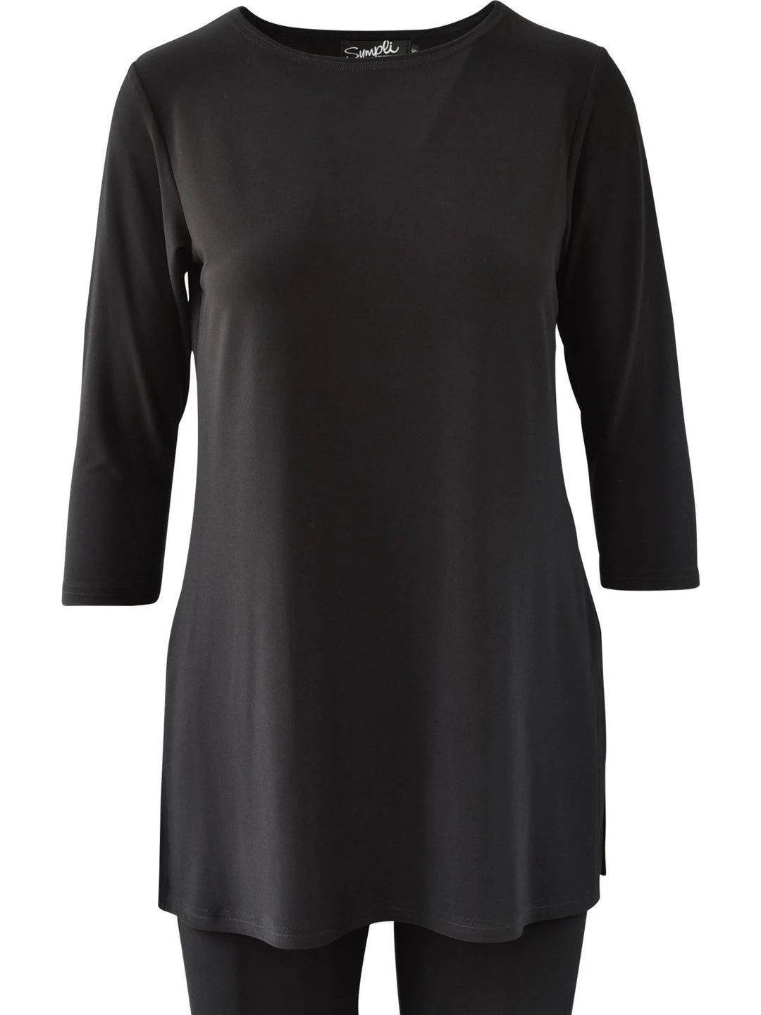 A Sympli essential, this basic tunic has a relaxed but straight fit, with a high round neckline and three quarter sleeves. Even hemline with side slit vents.