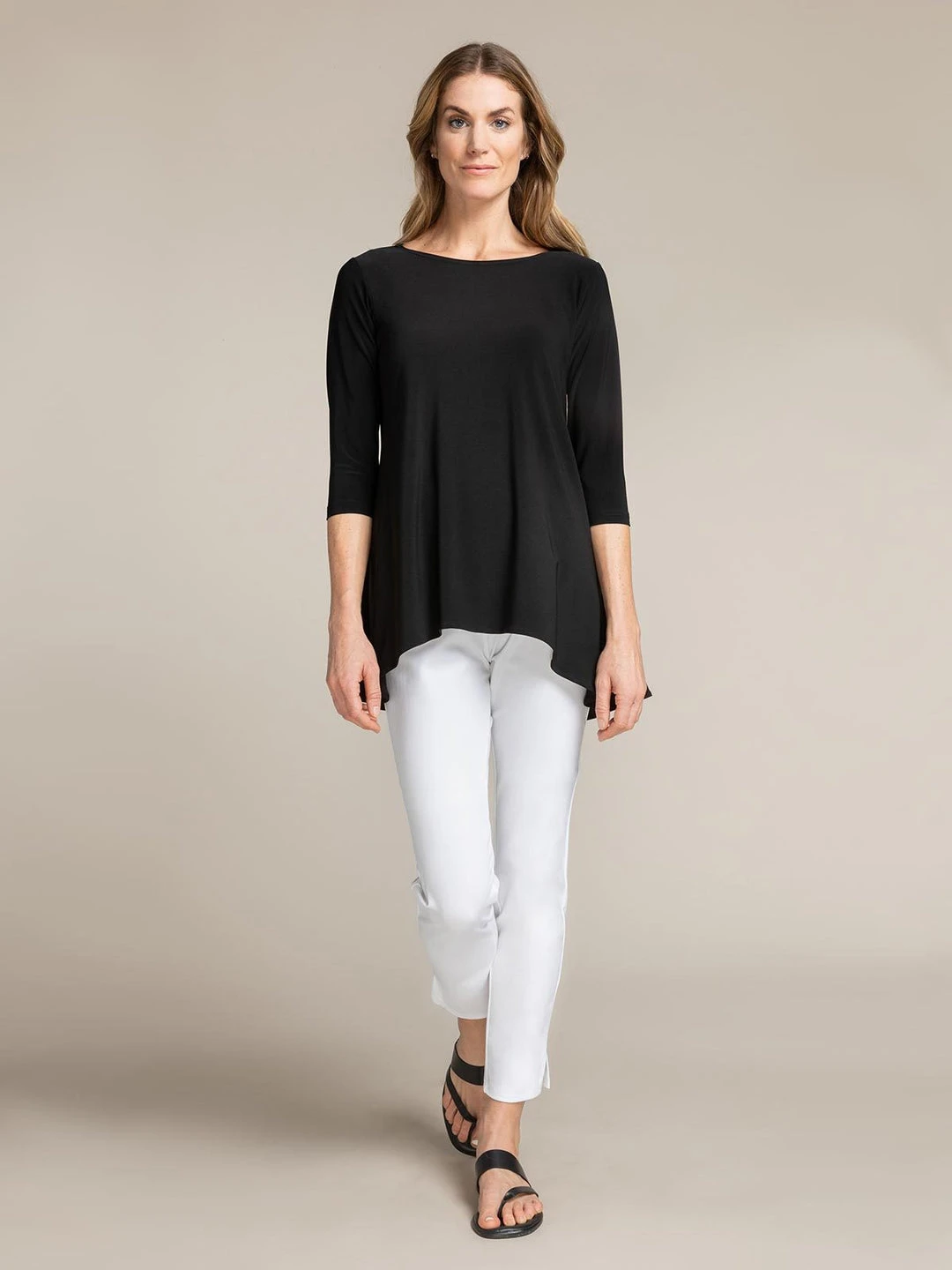 This Sympli essential features a high low hemline with an easy flared a-line body. Rounded boat neck with three quarter sleeves.