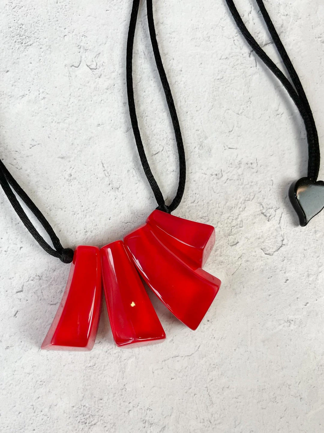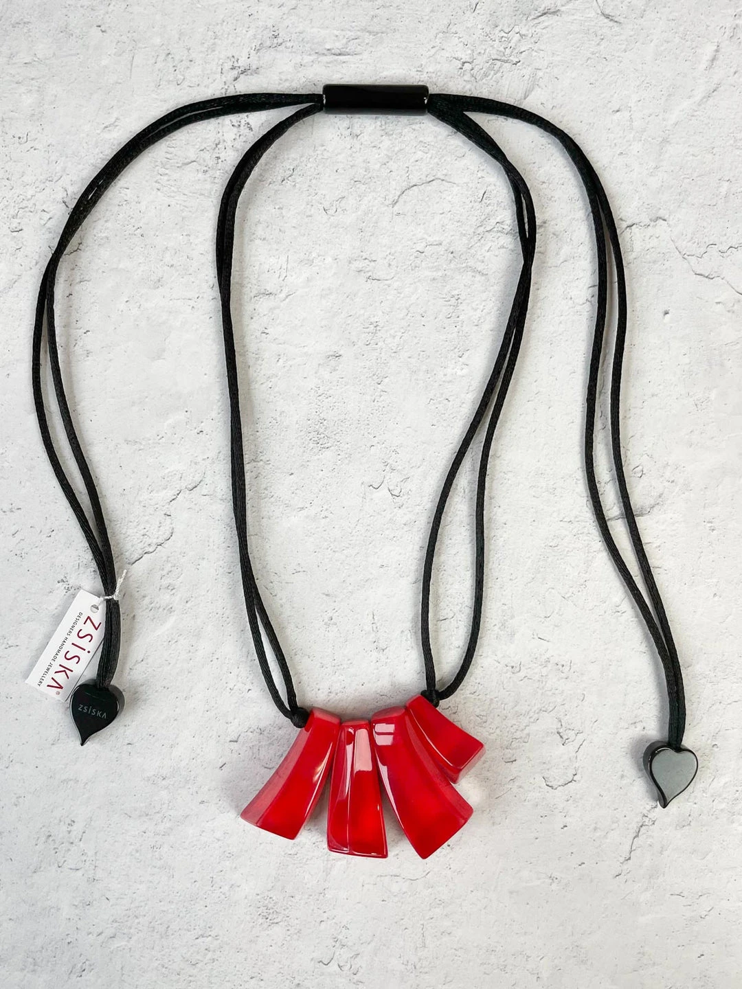 From Zsiska’s “Emocion” core collection, this adjustable necklace features a small four piece bib in three dimensional geometric resin, on fabric cord.