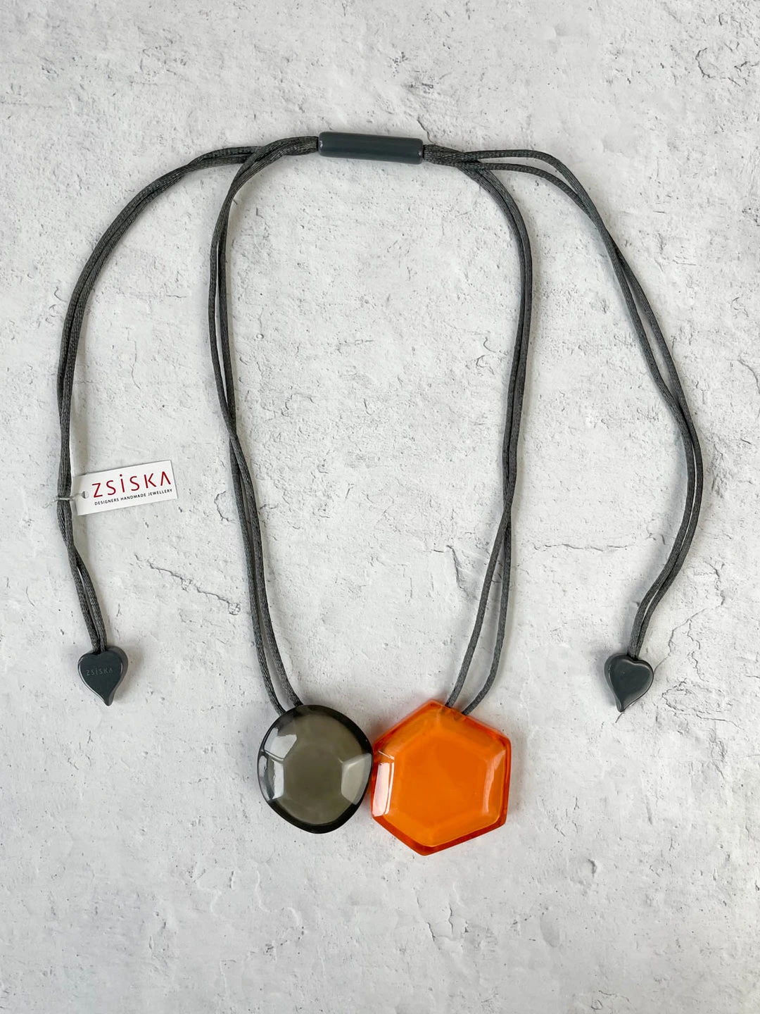 Part of Zsiska’s “Playa” collection, this adjustable necklace features two colored beads in faceted geometric shapes. The high shine resin stands out with juicy translucent color layered over a cream base. Coordinating grey fabric cord has adjustable pulls to adjust the length, as desired.