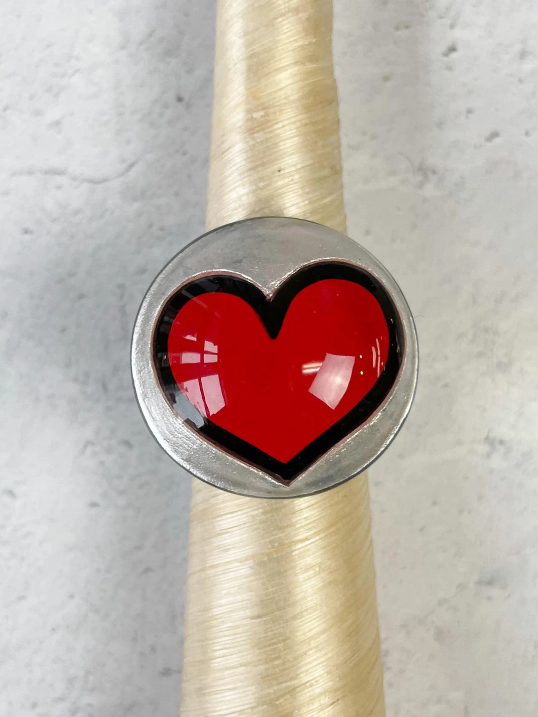 From Zsiska’s “Pop Art” collection, this statement ring features a circular domed face with layered heart motif, on a black resin band.