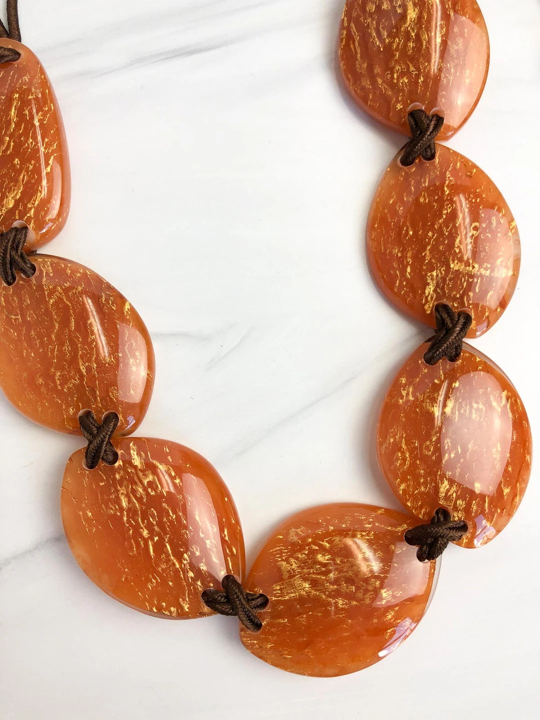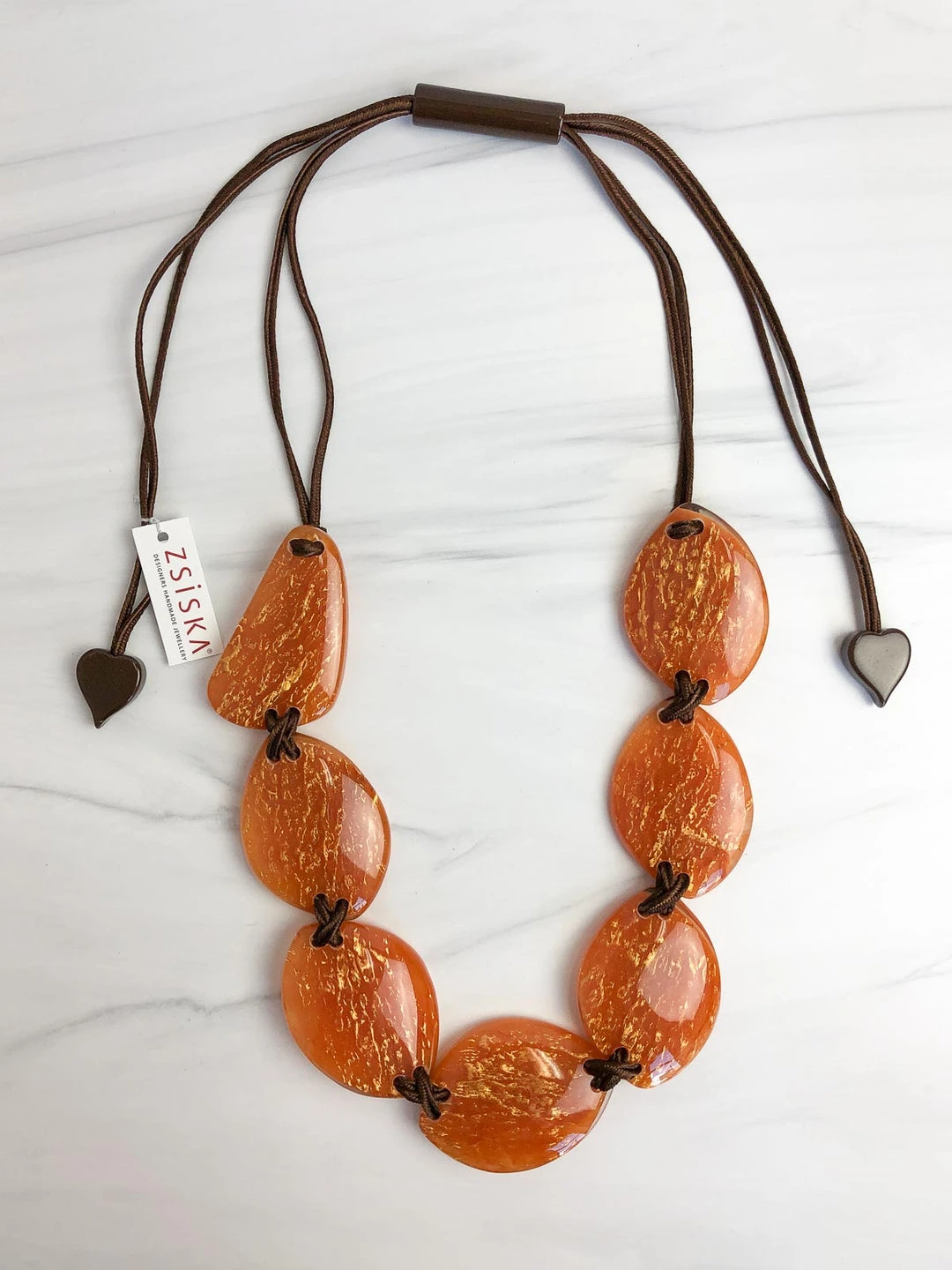 Zsiska’s “Rhea” collection features layered resin with textured gold accent. This bib style necklace features 7 almond shaped pieces on coordinating fabric cord.